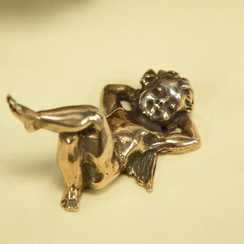 Kleine auf dem Rücken liegende Putte/Engel aus vergoldetem 925/-er Sterlingsilber. Sehr schöne und liebliche Ausführung mit einer Länge von ca. 3,4 cm. Gewicht ca. 11 Gramm