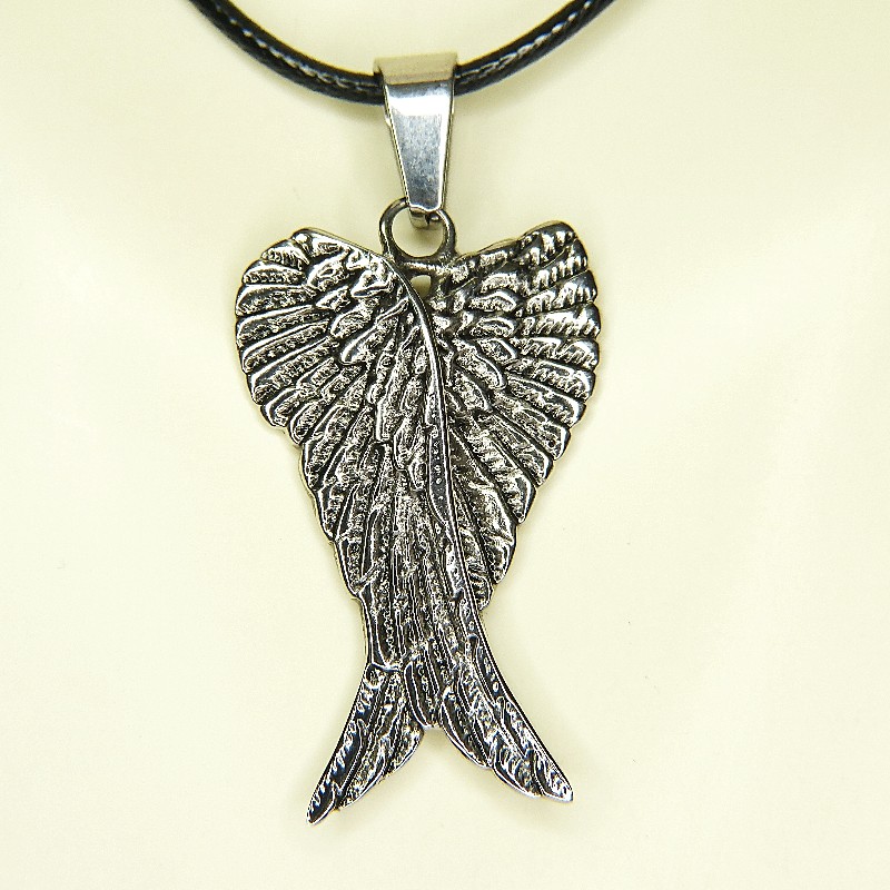 Glänzender Anhänger aus Edelstahl als Engelsflügel gearbeitet in einer Größe von ca. 33 x 21 mm.