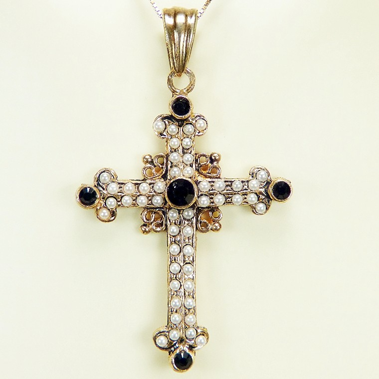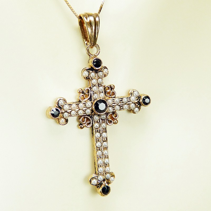 Aus 925/-er Silber gefertigter Kreuzanhänger in Rosè-Vergoldung mit Perlen besetzt.