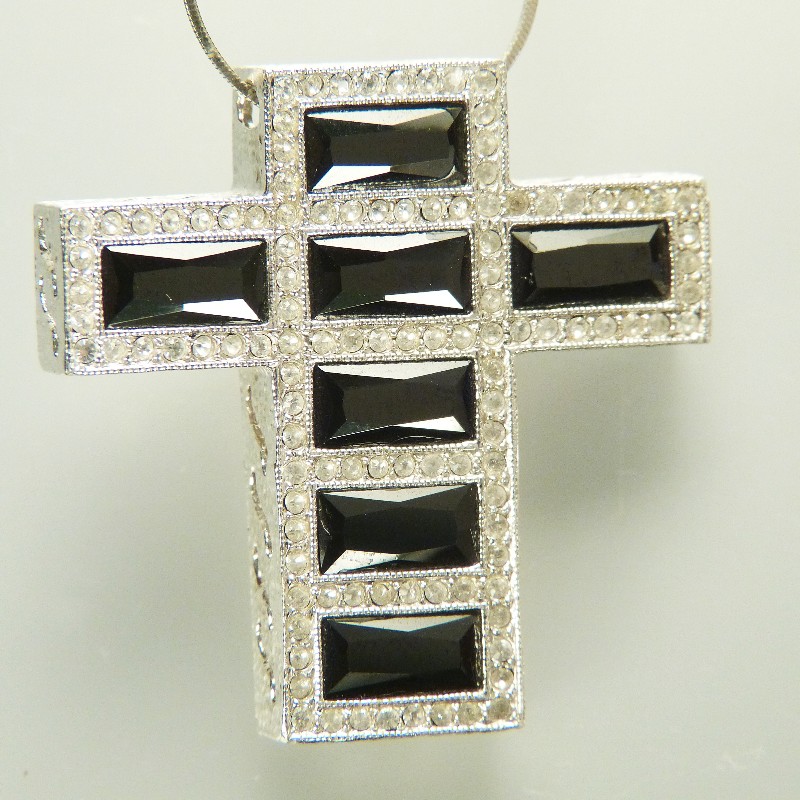 Moderner Kreuz-Anhänger aus 925/-er Silber mit vielen facettierten weißen und schwarzen Zirkonia.