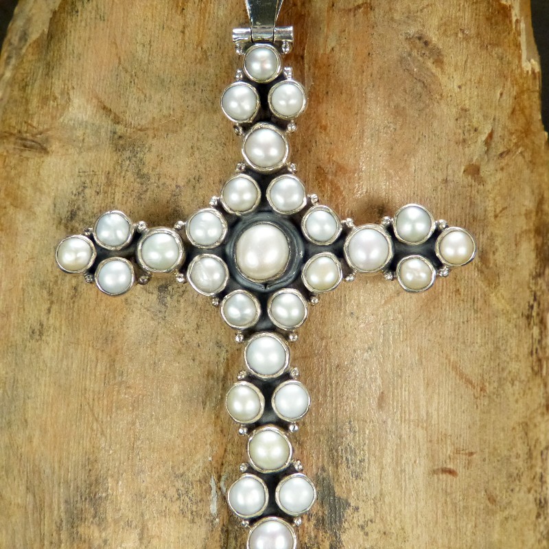 Großes Kreuz aus Silber 925/-, kombiniert mit echten Süßwasserperlen.