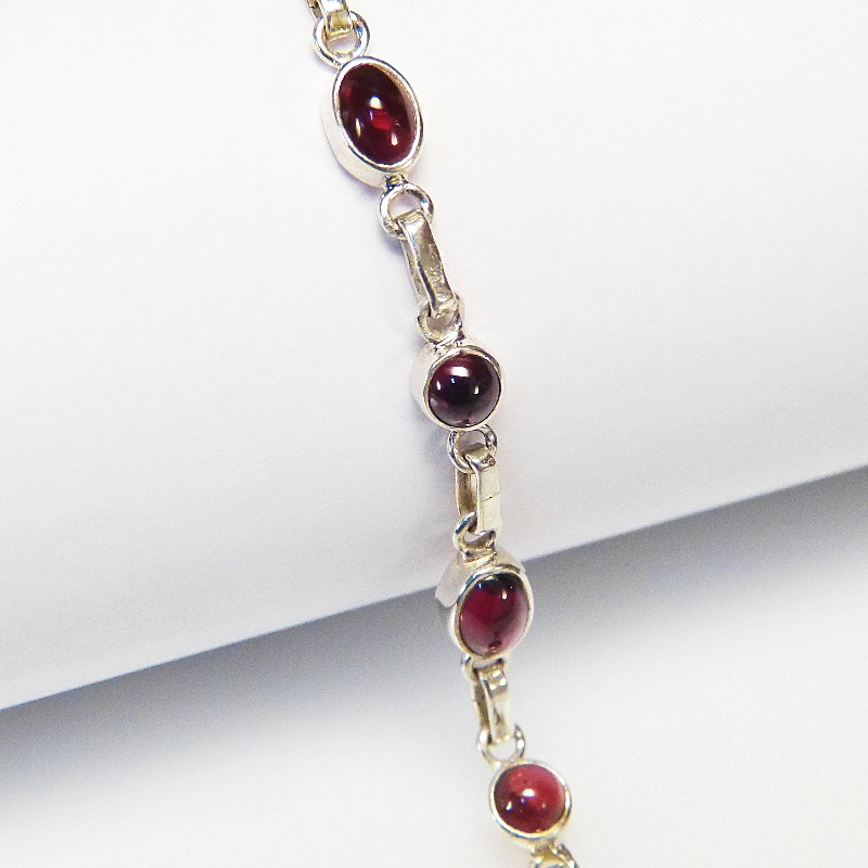 Zartes Armband aus 925/-er Silber mit eingefassten Cabochons aus Granat. Die Breite misst ca. 6mm und die Länge kann von ca. 19 cm bis ca. 212 cm variiert werden.