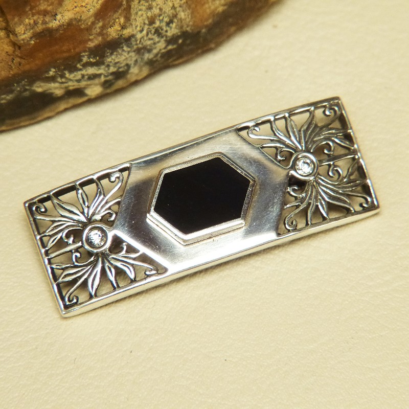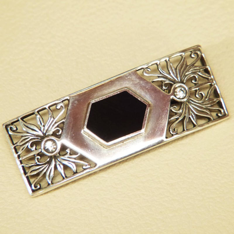 Eckige Anstecknadel mit floralem Motiv und schwarzer Emaille, kombiniert mit zwei kleinen Similisteinen. Größe ca. 42 x 16 mm, rückseitig mit Sicherheitsverschluss