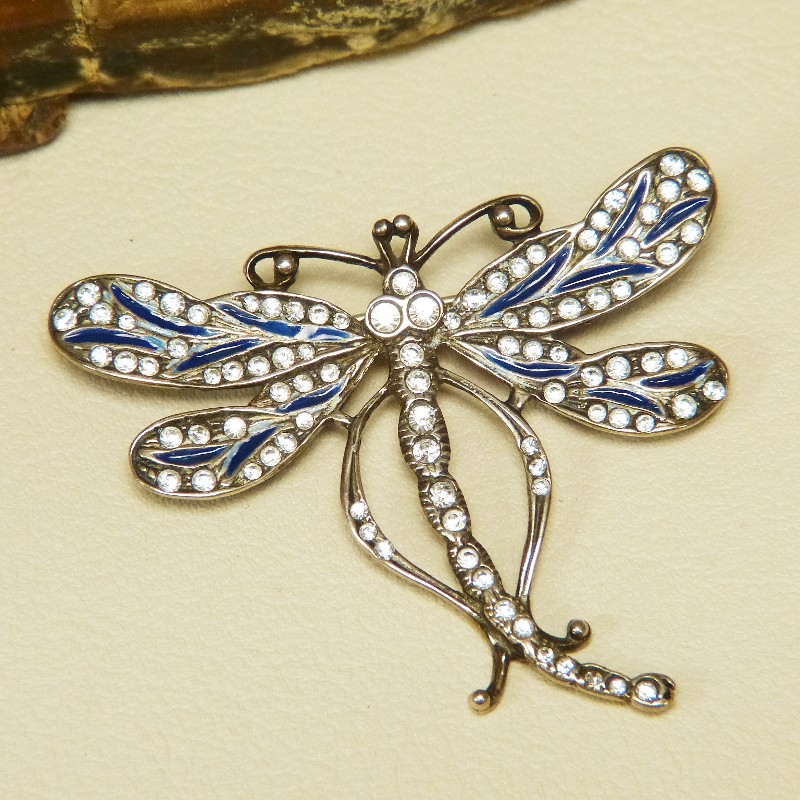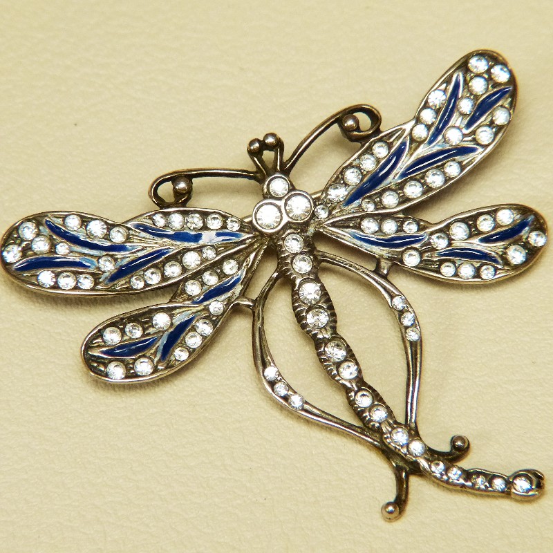 Libelle mit weißen Similisteinchen und blauer Kaltemaille in 925/-er Silber gearbeitet. Größe ca. 52 x 45 mm, rückseitig mit Sicherheitsverschluss