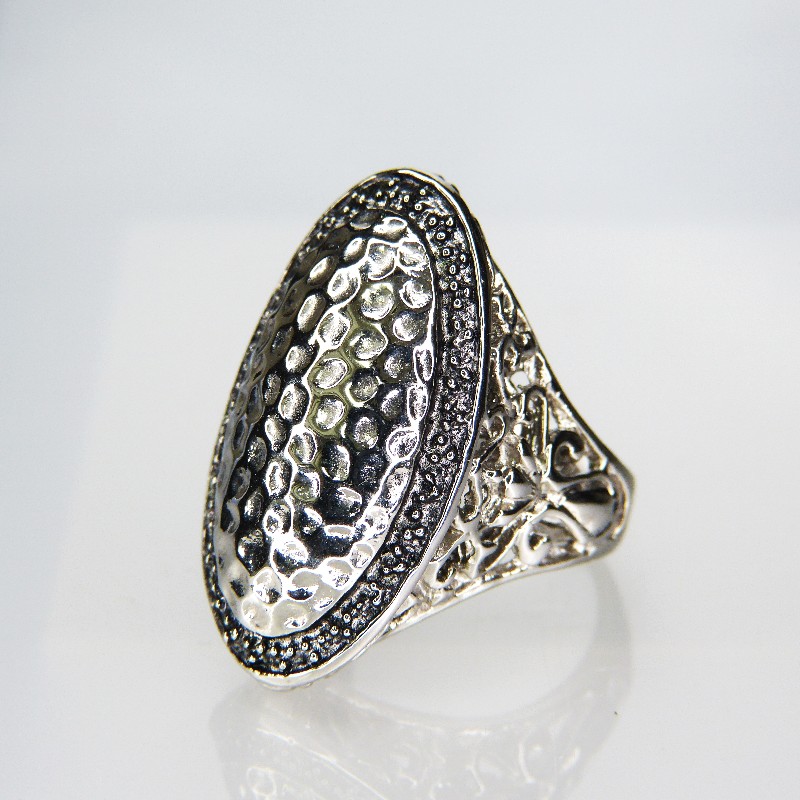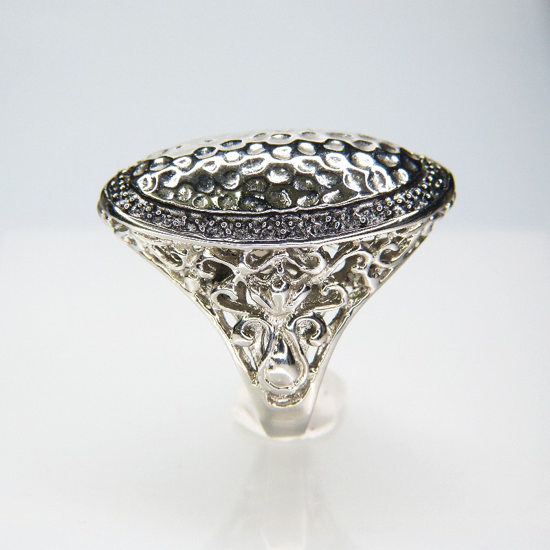 Edelstahlring mit gehämmerter Oberfläche und seitlichen Verzierungen.