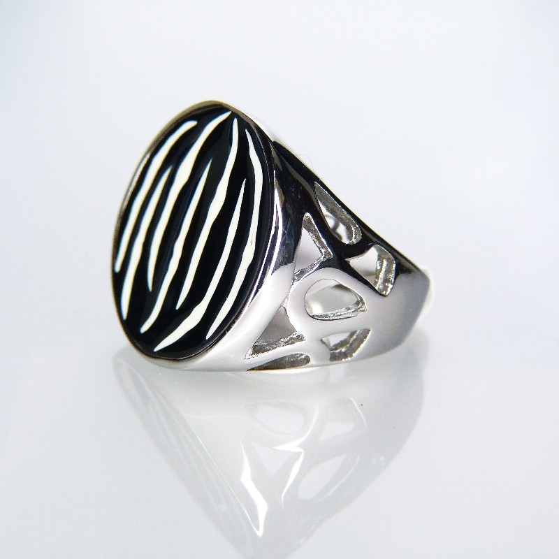 Edelstahlring mit Zwbradesign und seitlichen Verzierungen.