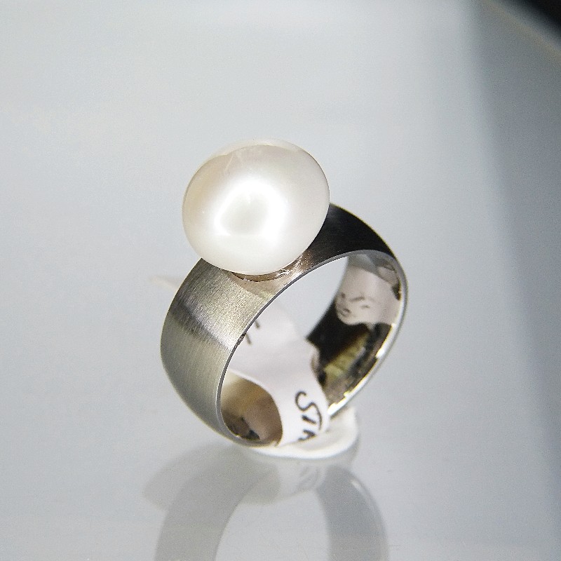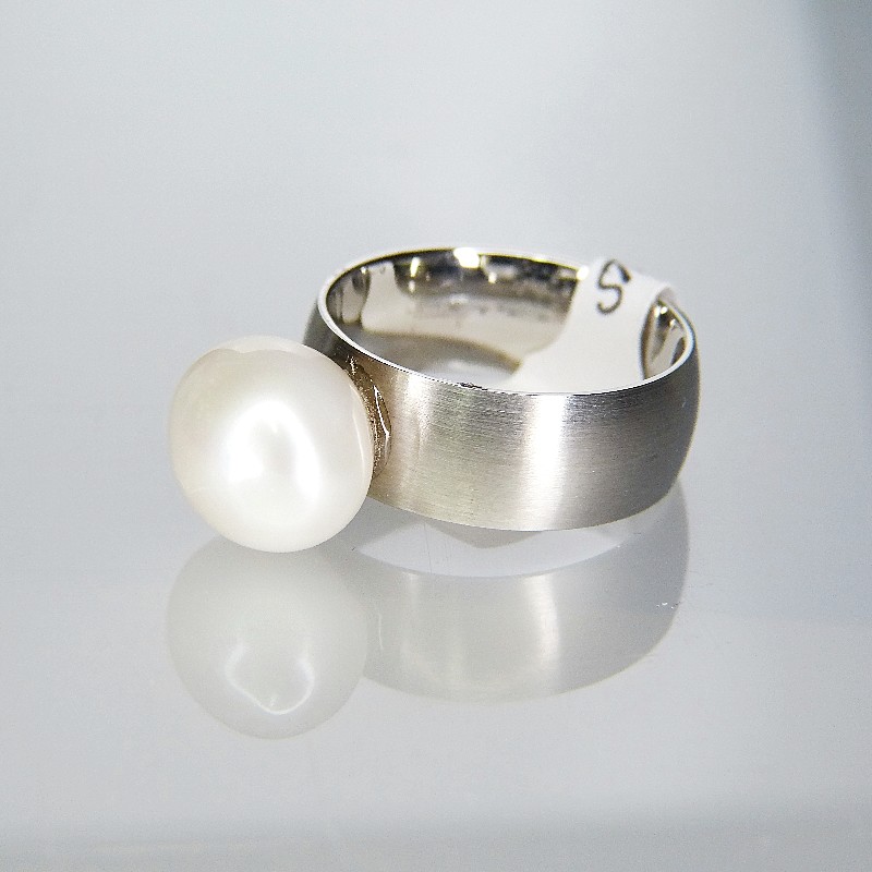 8mm breiter mattierter Edelstahlring mit echter weißer Perle mit einer Größe von ca. 11x12mm und einer Höhe von ca. 9mm.