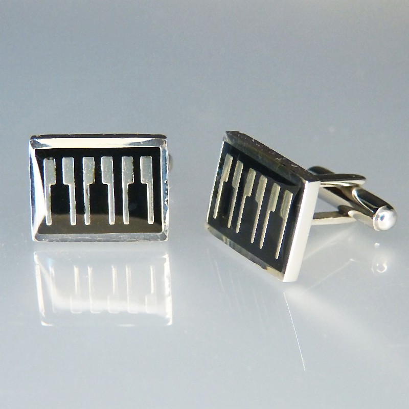 Manschettenknöpfe aus Hochglanz poliertem Edelstahl mit Einlage aus schwarzer Kaltemaille und gut einrastender Mechanik.