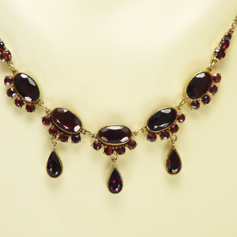 Aus vergoldetem 925/-er Silber gefertigtes Collier mit schönen dunklen böhmischen Granaten in einer Gesamtlänge von ca. 44cm.