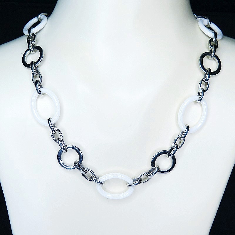 Collier/Kette aus hochglanz poliertem Edelstahl, kombiniert mit weißen Keramikelementen.