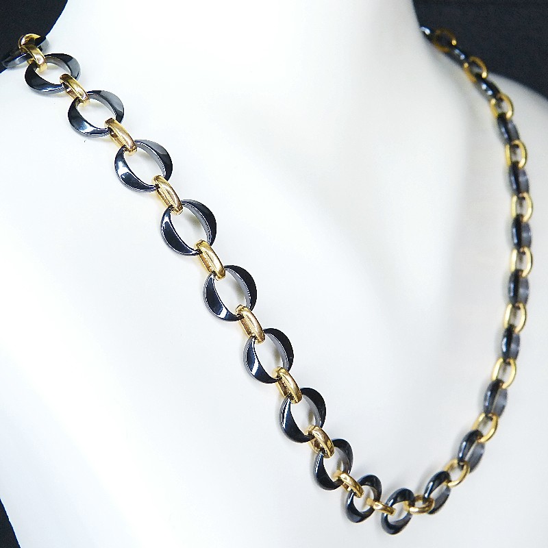 Collier/Kette aus hochglanz poliertem und IP-vergoldetem Edelstahl, kombiniert mit dunkelgrauen Hämatitringen.