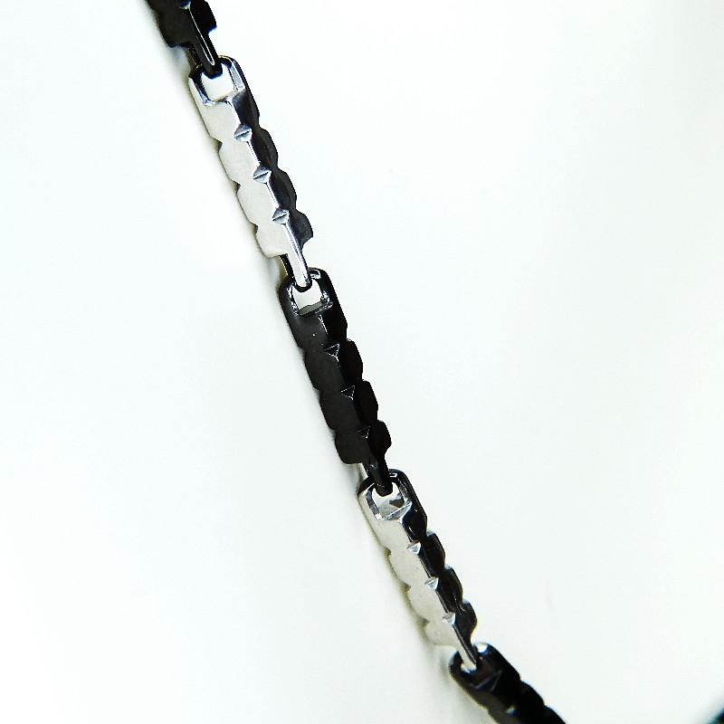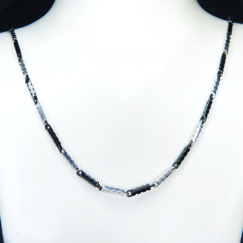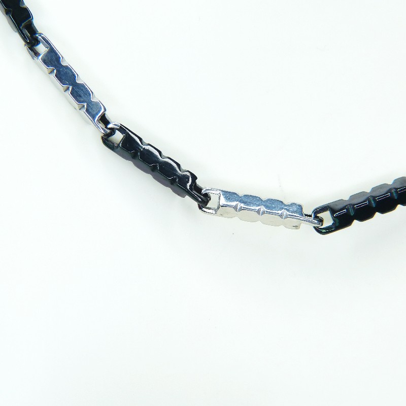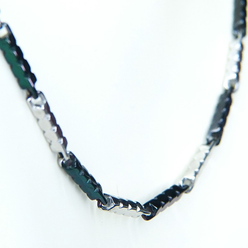 Collier/Kette aus hochglanz poliertem Edelstahl mit beschichteten Elementen die je nach Lichteinfall grünlich/bläulich/braun oder schwarz schimmern.
