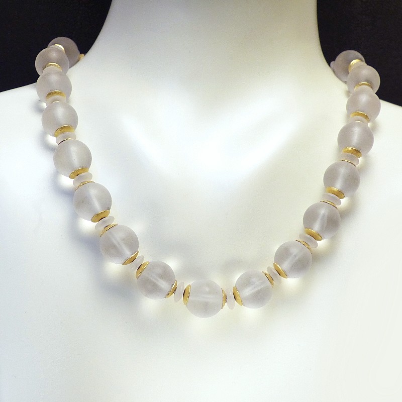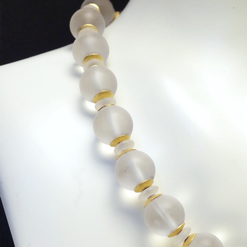 Ca. 14 mm dicke Kugelkette aus mattiertem Bergkristall, kombiniert mit Zwischenelementen aus goldplattiertem 925/-er Silber.