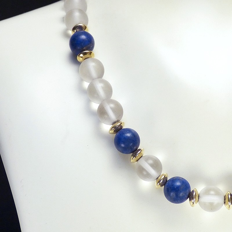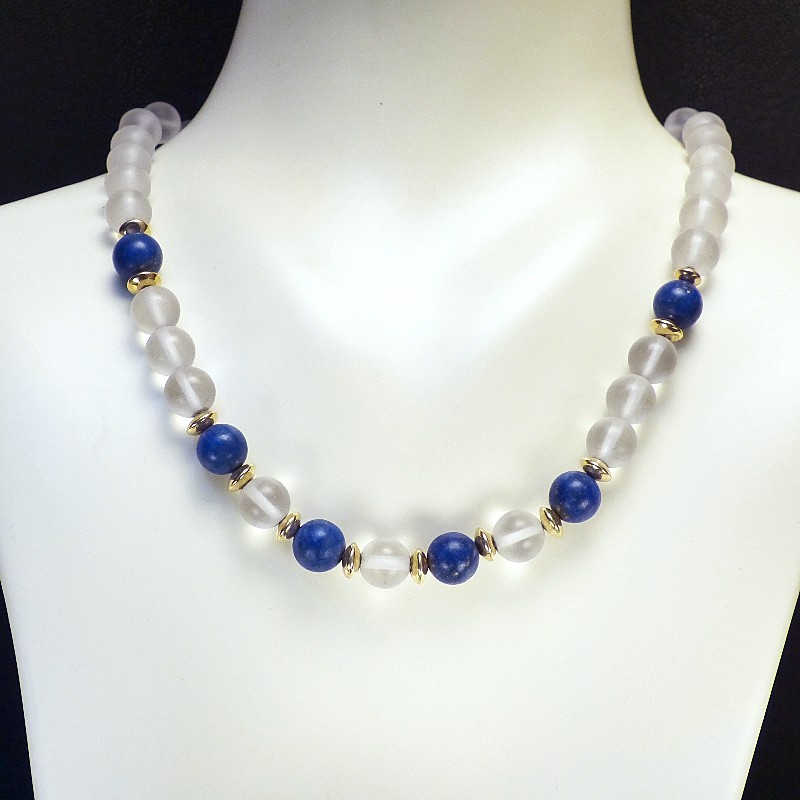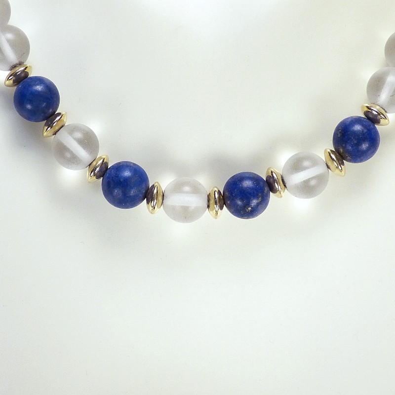 Kette aus mattierten Bergkristallkugeln, kmbiniert mit Lapislazuli und Zwischenelementen aus 585/-er Gold.