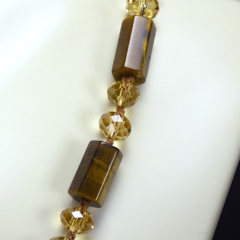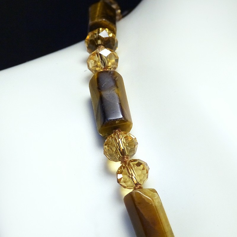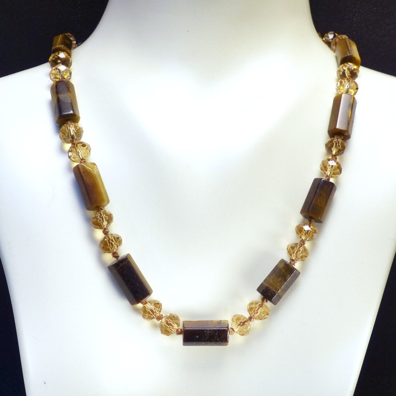 Kette aus 6-eckig geschliffenen Tigerauge-Zylindern, kombiniert mit fein facettierten Glasperlen.