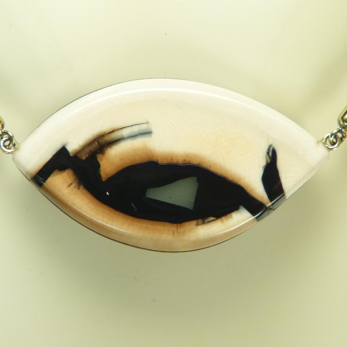 Collier aus cremefarbenem Mammut-Elfenbein mit braunen Färbungen in einer Gesamtgröße von ca. 50 x 28 mm, kombiniert mit einer Intarsie aus rekonstruierter Jade.