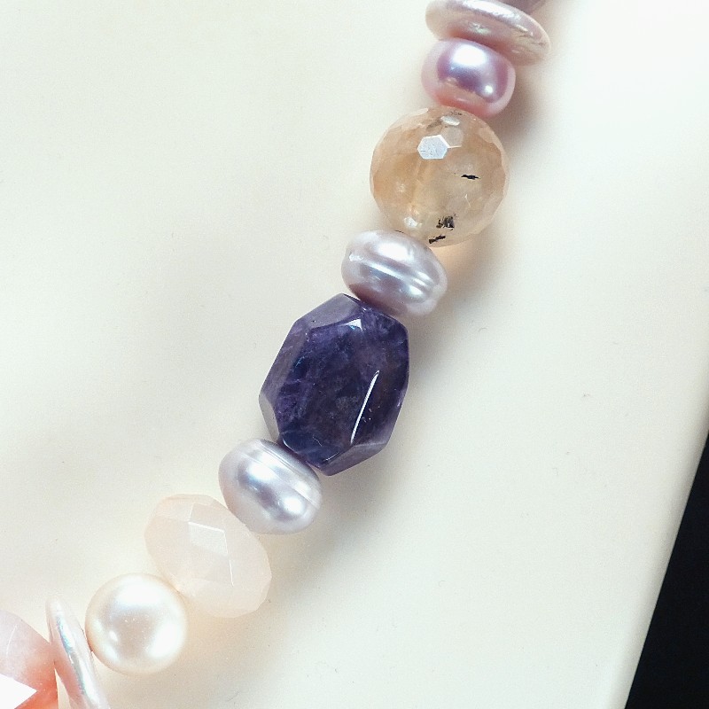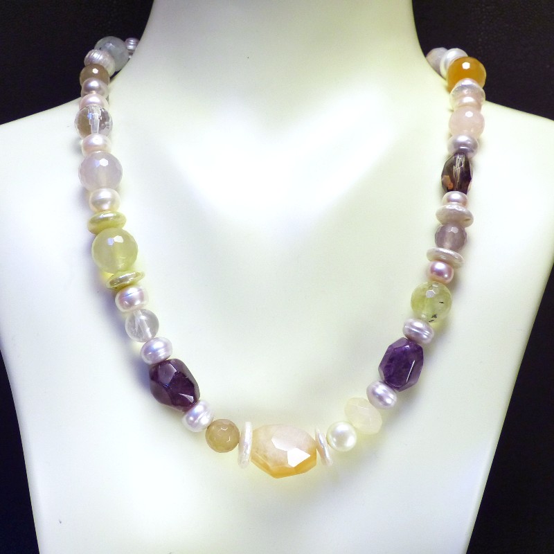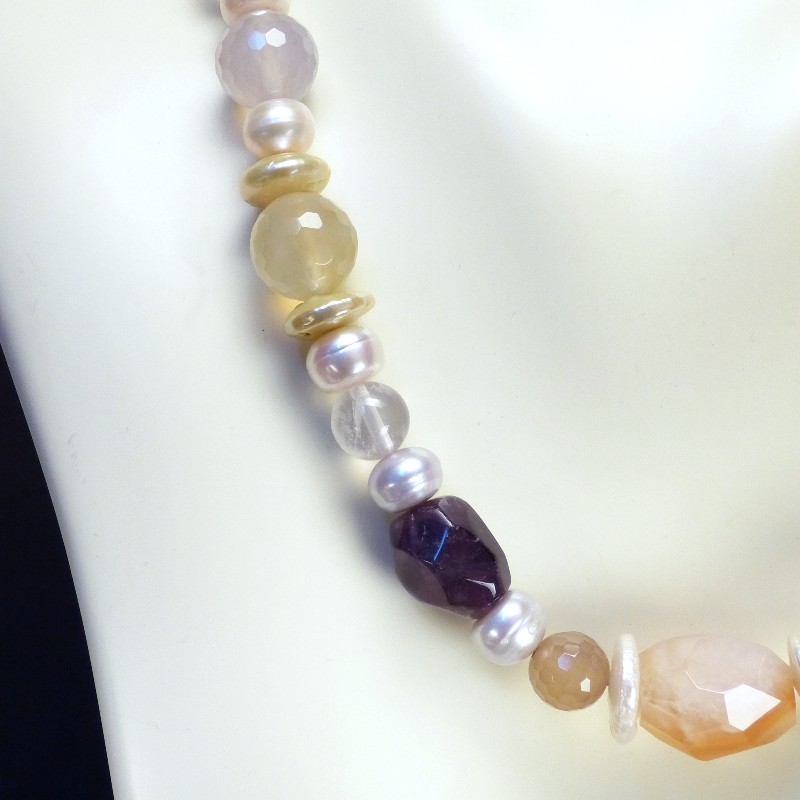 Kette aus unterschiedlichen, teils facettierten Elementen aus Achat, Bergkristall, Amethyst und Mondstein, kombiniert mit Süßwasserperlen.