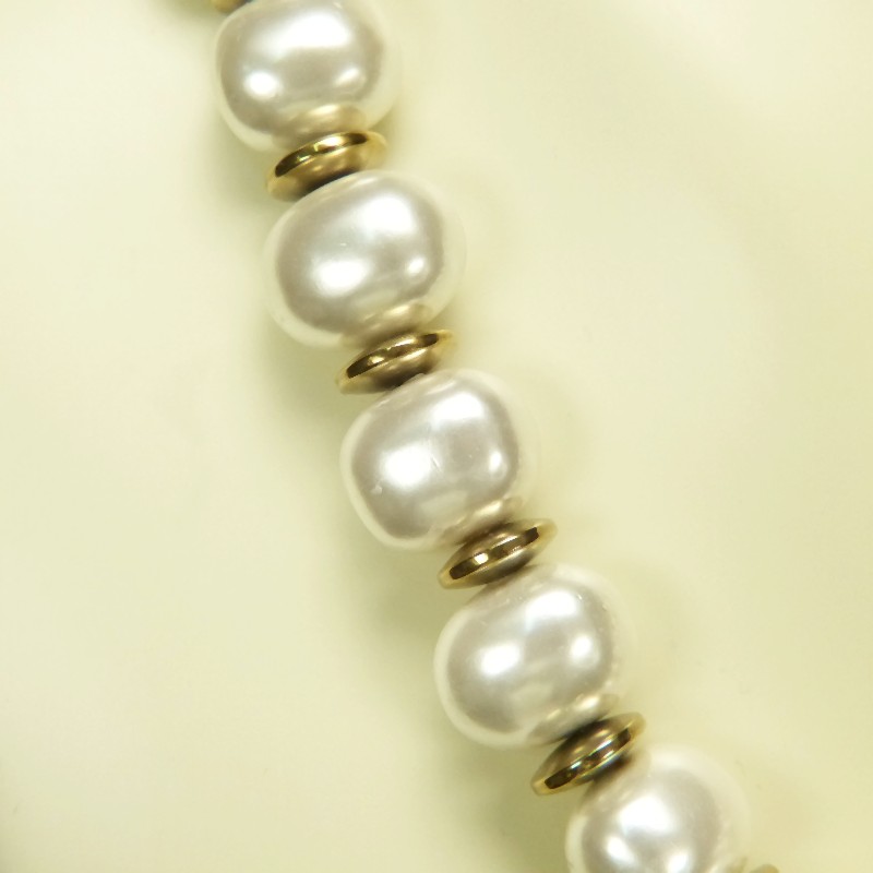 Edle Muschelkernperlen in ovaler Barockform in einer Größe von ca. 12x15mm, kombiniert mit Zwischenelementen aus Hämatit. Durch den mehrfach gedrehten Stahldraht und dem großen Karabinerverschluss aus vergoldetem Silber wird die Kette sicher gehalten. Die Gesamtlänge misst ca. 47cm.
