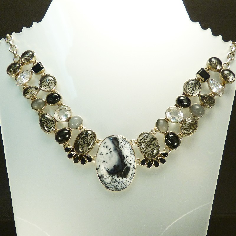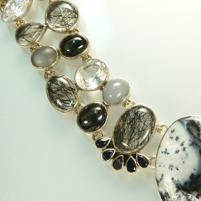 Großes Silbercollier 925/-, aufwändig mit Jaspis, Bergkristall, Rutilquarz und Onix gefasst. Für einen guten Tragekomfort wurden die einzelnen Elemente beweglich gearbeitet.