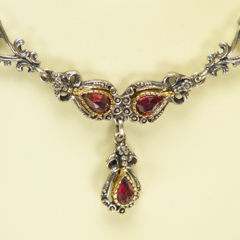 Schönes im Antik-Finish gefertigtes Trachtencollier aus 835/-er Silber mit facettierten Granatsteinen, eingefasst in vergoldeten Zargen.