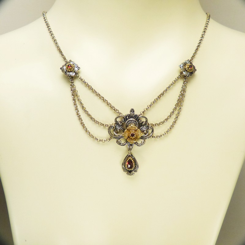 Schönes im Antik-Finish gefertigtes Trachtencollier aus 835/-er Silber mit facettierten Granatsteinen, eingefasst in vergoldeten Zargen.