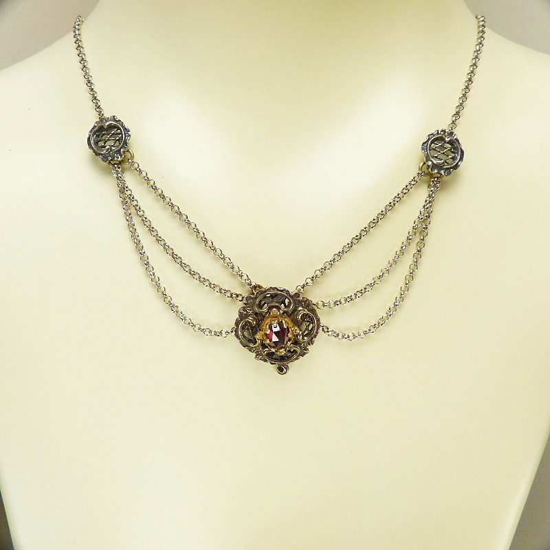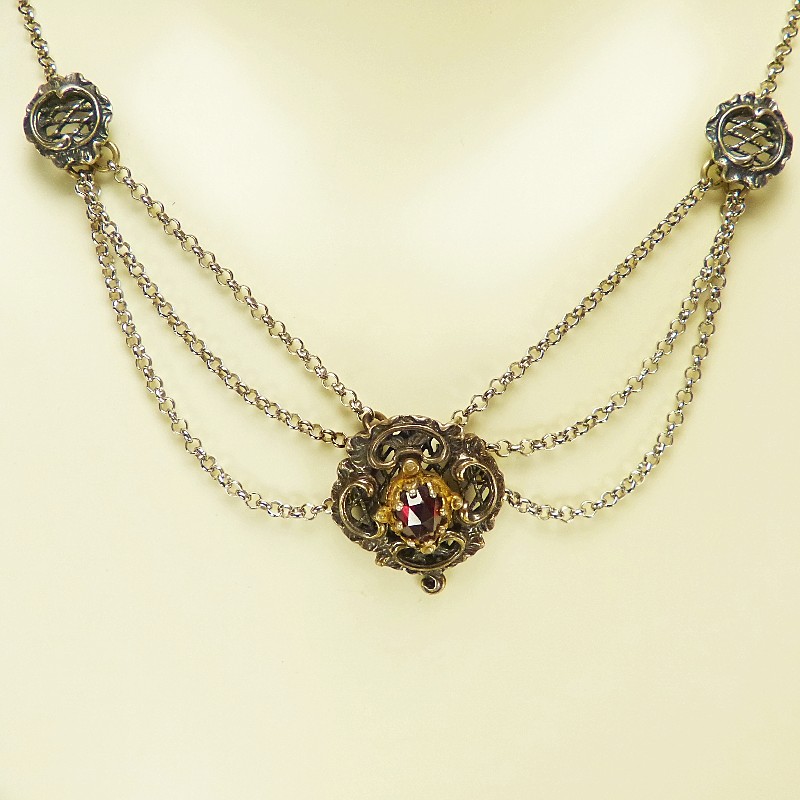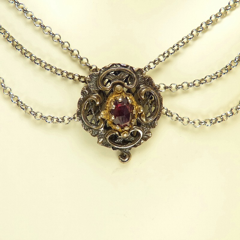 Schönes im Antik-Finish gefertigtes Trachtencollier aus 835/-er Silber mit facettierten Granatsteinen, eingefasst in vergoldeten Zargen.