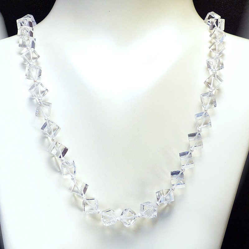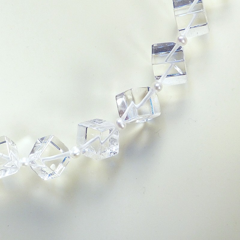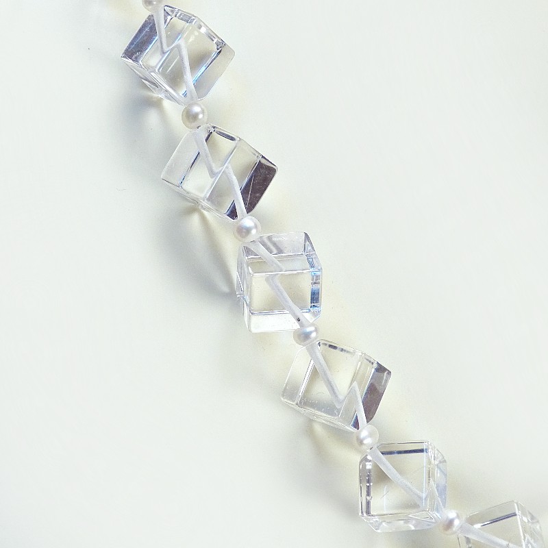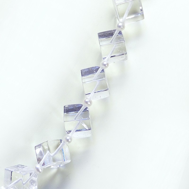 Kette aus Hochglanz polierten und klarem, diagonal gebohrten Bergkristall-Würfeln, kombiniert mit kleinen weißen Süßwasserperlen.