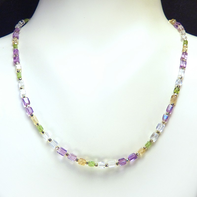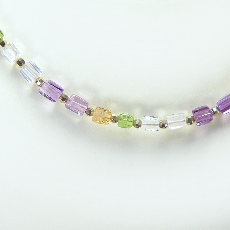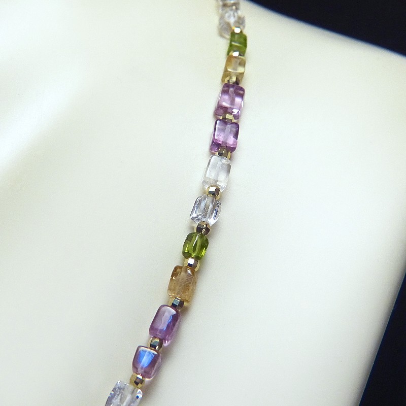 Zarte Kette aus kleinen Stein-Quadern wie z.B. Peridot, Amethyst, Citrin und Bergkristall, kombiniert mit Zwischenelementen aus goldplattiertem 925/-er Silber.
