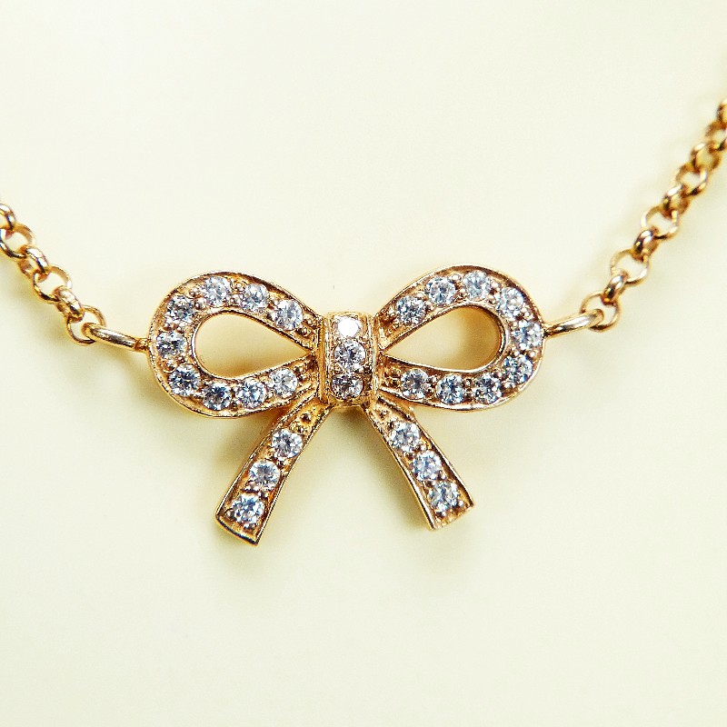 Aus 925/-er Silber gefertigtes zartes Collier mit Schleifenmotiv, besetzt mit weißen Zirkonia in Rosè-Vergoldung.