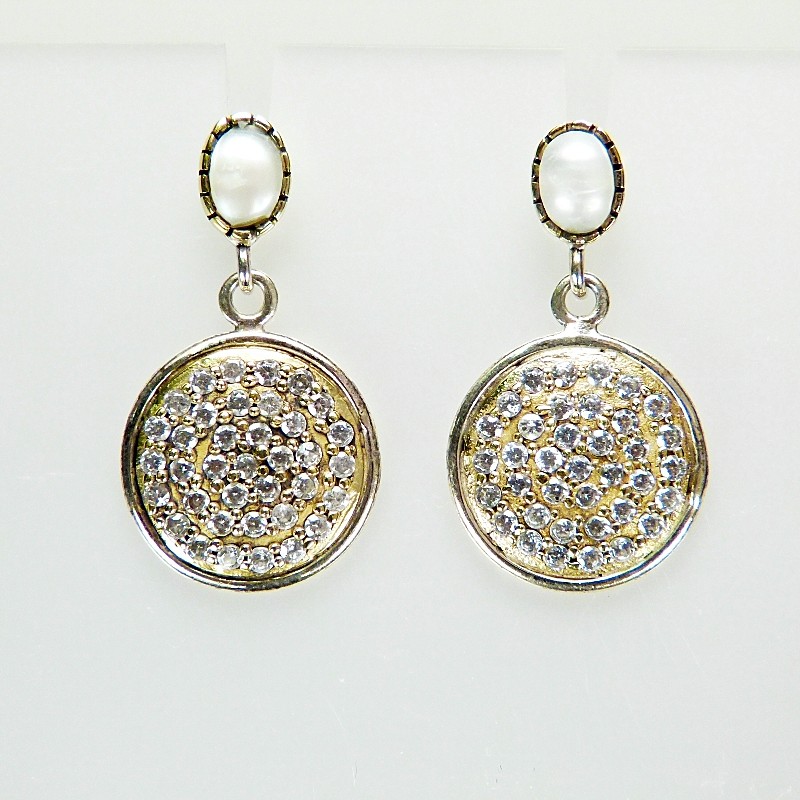 Ohrhänger aus Silber 925/- mit Teilvergoldungen, besetzt mit vielen kleinen Weißtopasen und Süßwasserperle.