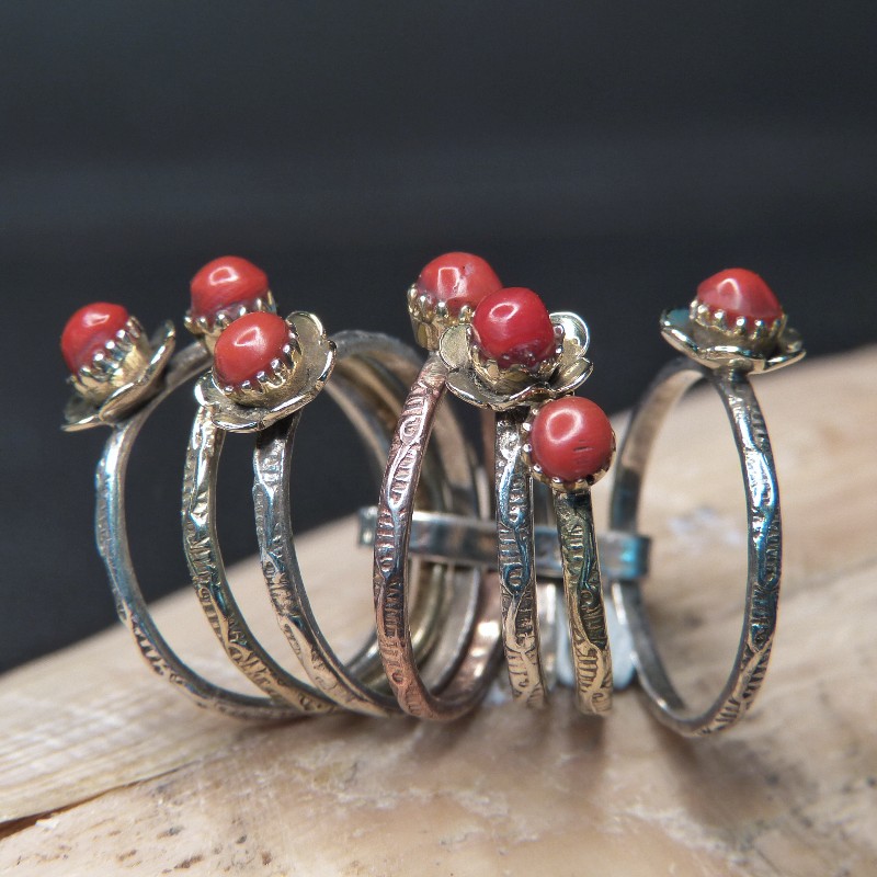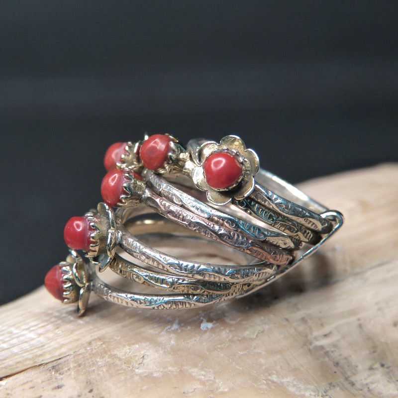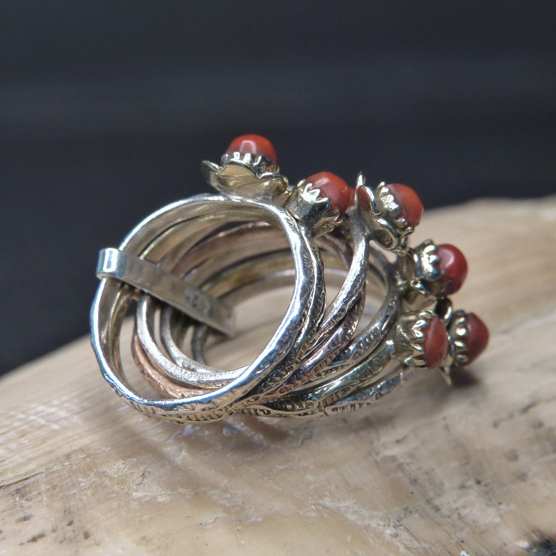 Set aus 7 miteinander verbundenen und beweglichen anzuordnenden Ringen aus teils vergoldetem Silber 925/- mit echten Korallen.