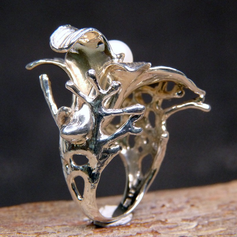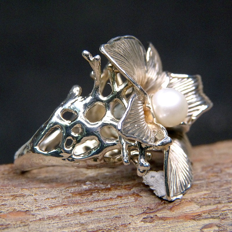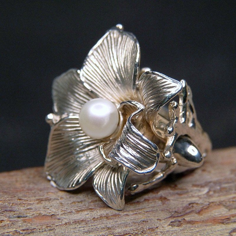 Extra großer und verspielter Blütenring aus Silber 925/- mit echter Perle.