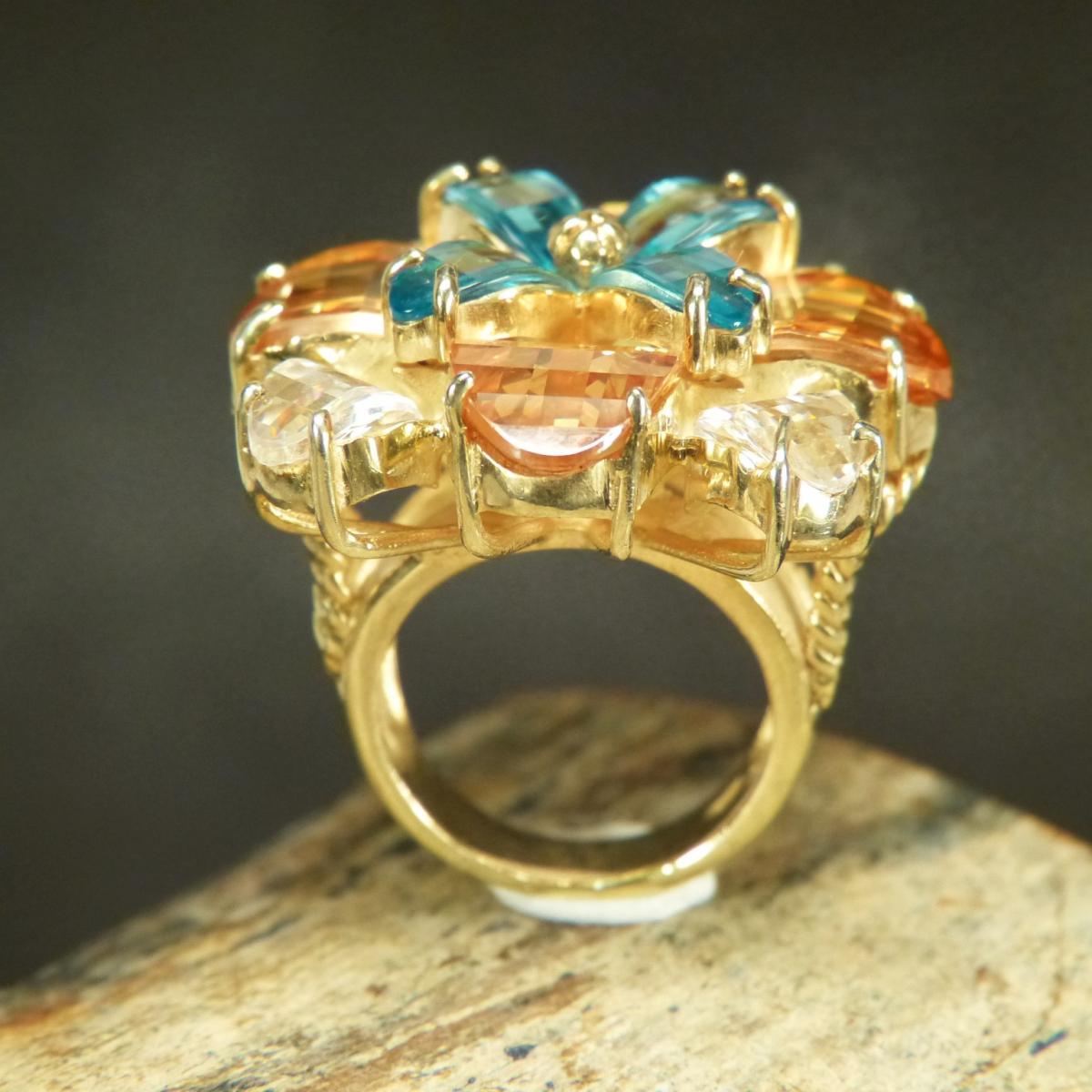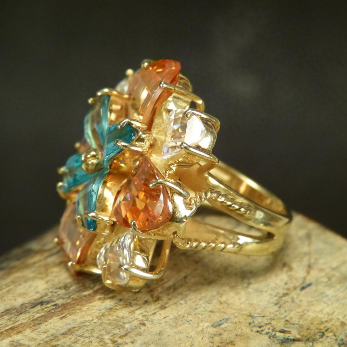 Großer, auffälliger und schwerer Ring aus vergoldetem 925/-er Silber mit facettierten Zirkonia in den Farben Light Saphire/Topaz und Chrystal.