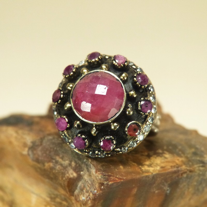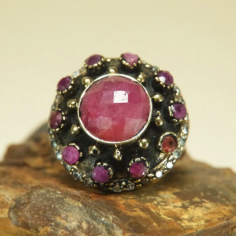 Toller auffälliger Ring aus 925/-er Silber mit Teilvergoldungen im orientalischen Stil gearbeitet. Viele kleine Weißtopase reihen sich als Basis um eine Reihe facettierter Rubine die mit vergoldeten Elementen kombiniert sind.
