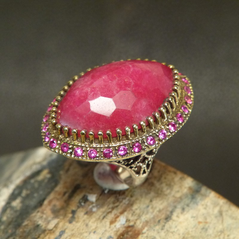 Großer auffälliger Ring aus 925/-er Silber mit Teilvergoldung und eingefassten Rubinen.