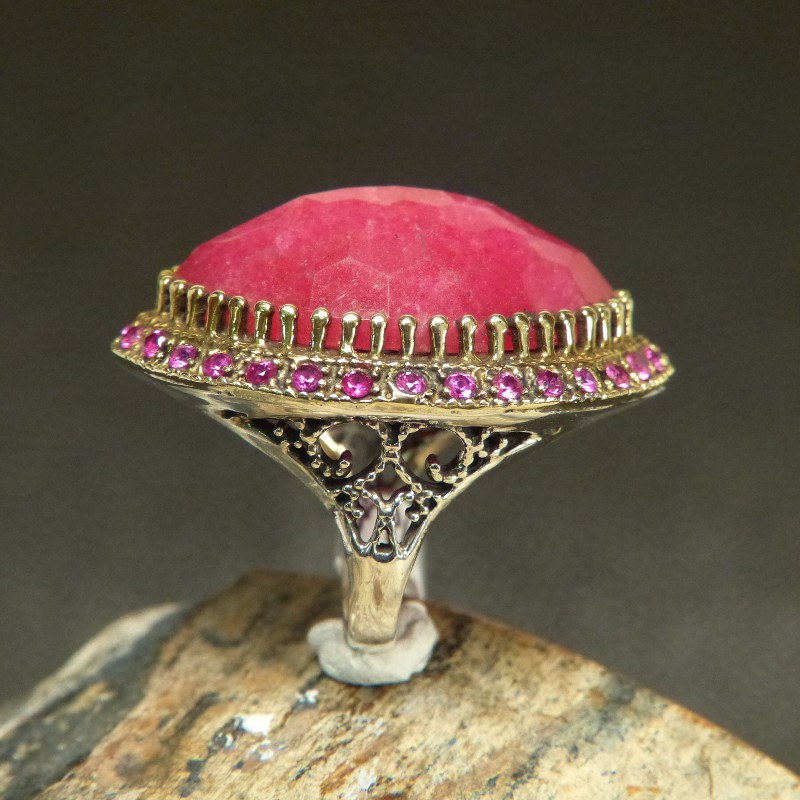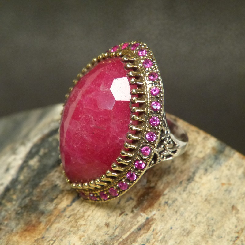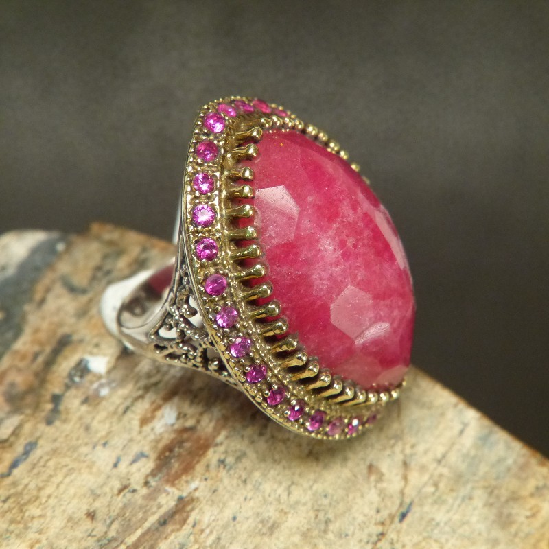 Großer auffälliger Ring aus 925/-er Silber mit Teilvergoldung und eingefassten Rubinen.