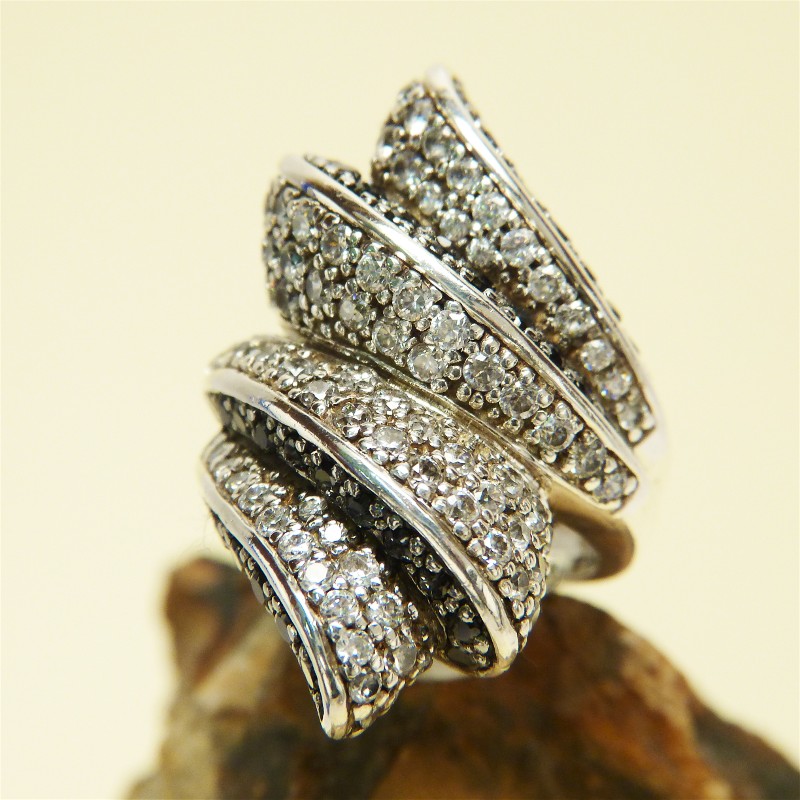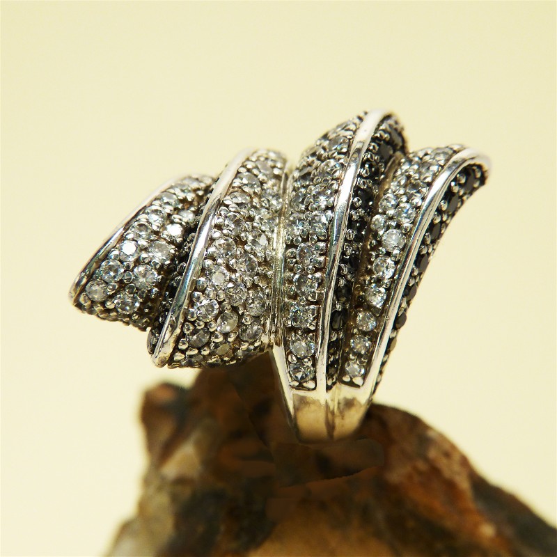 Auffälliger Ring aus 925/-er Silber mit vielen eingefassten schwarzen und weißen Zirkonia. Die gesamte Länge misst ca. 34mm bei einer Breite von ca. 23mm.