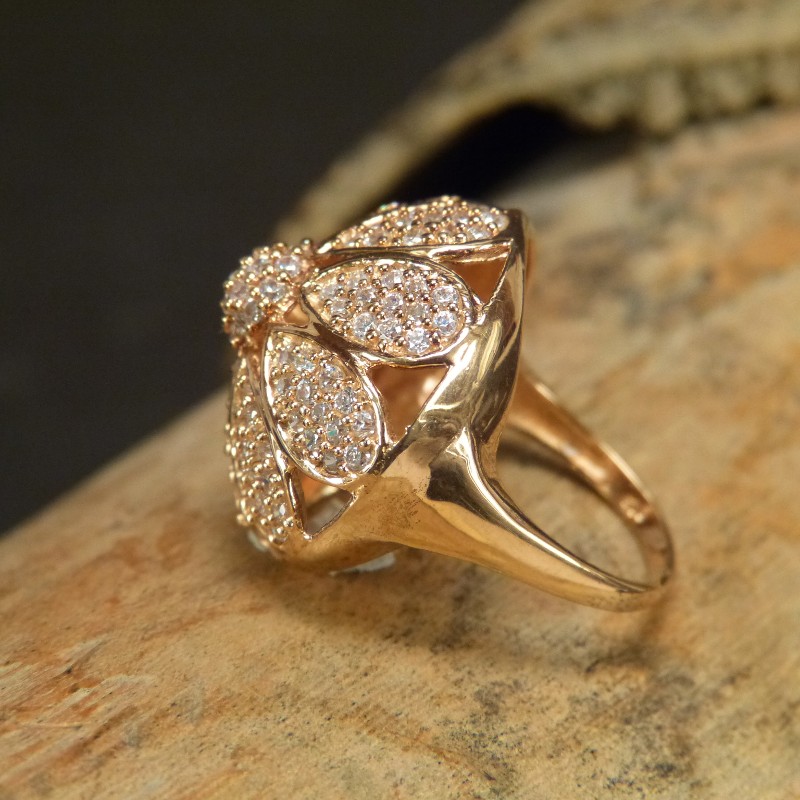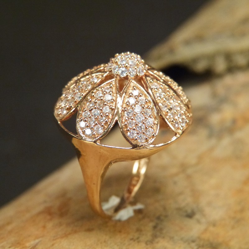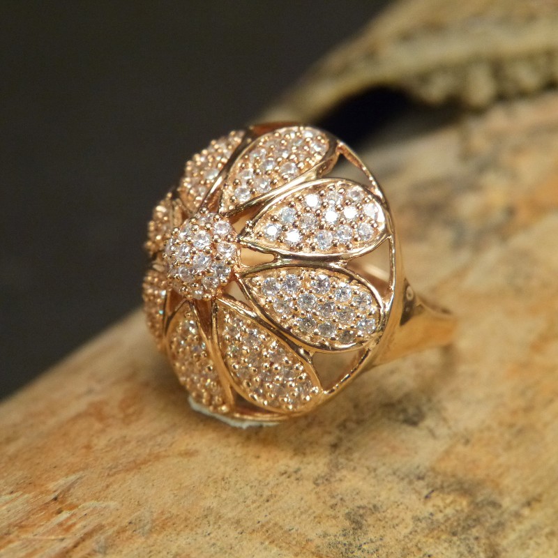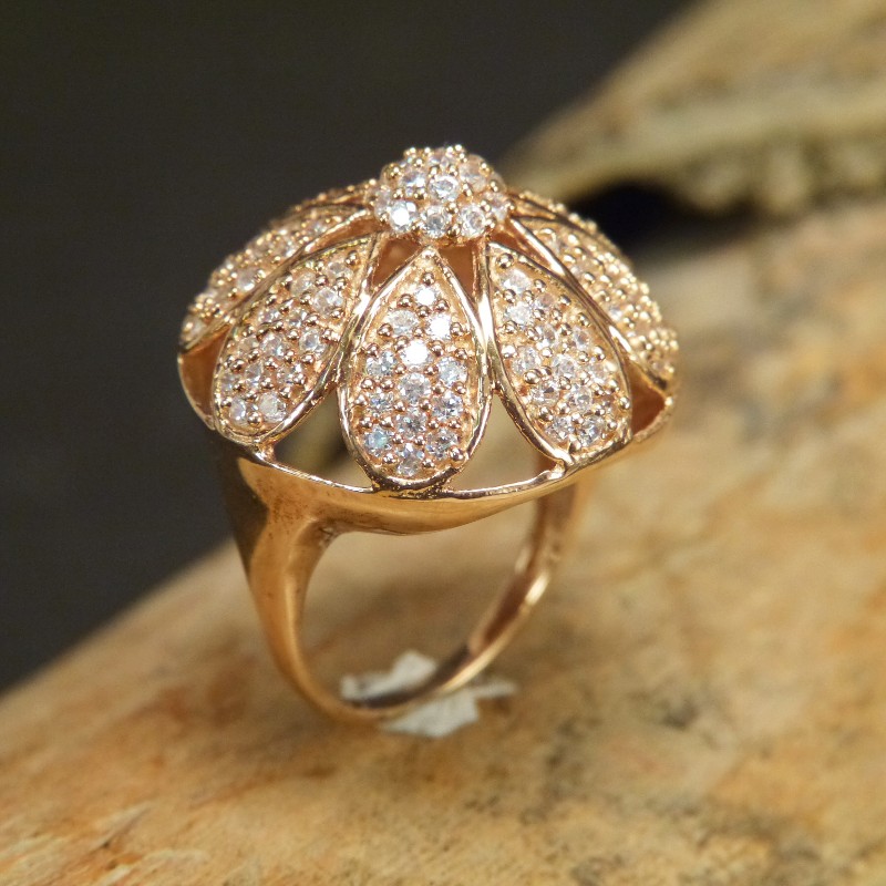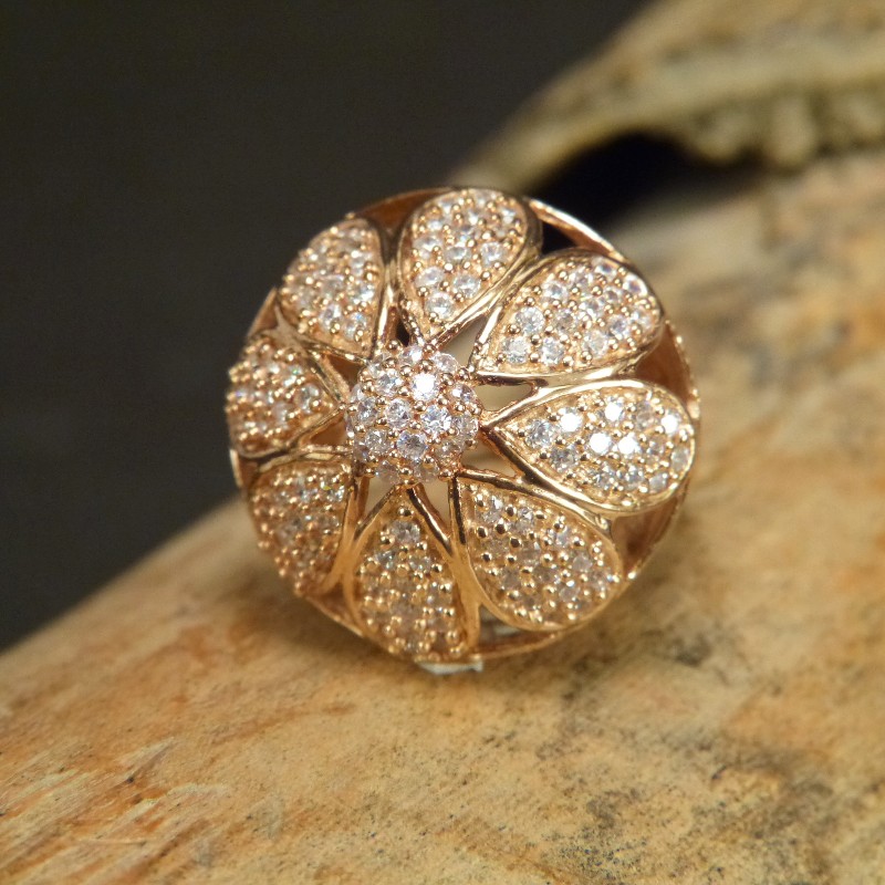 Auffälliger Ring aus vergoldetem 925/-er Silber, besetzt mit vielen kleinen Zirkonia. Der Durchmesser der Kuppe misst ca. 24mm bei einer Höhe vonca. 12mm.