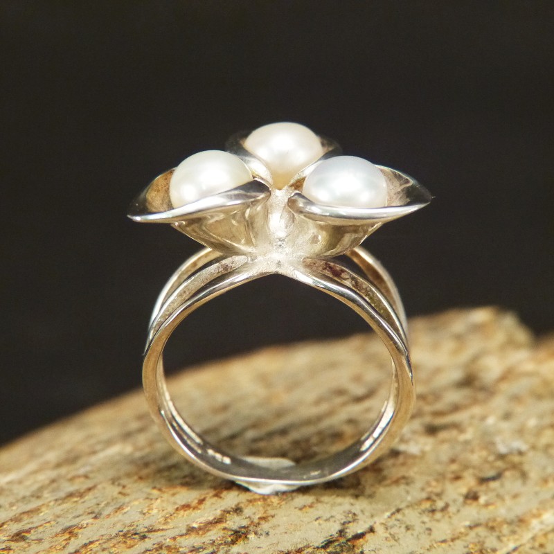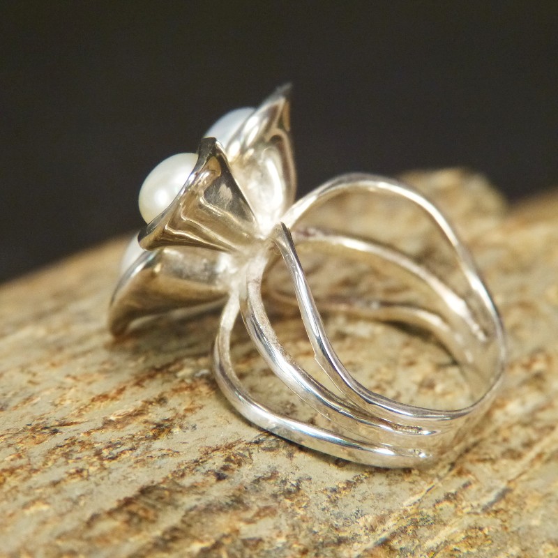 Ring aus 925/-er Silber mit drei Süßwasserperlen, eingebettet in je einen Blütenkelch mit einem Durchmesser von insgesamt ca. 25mm.