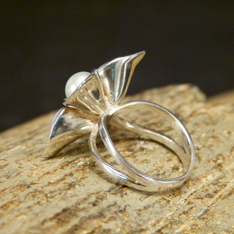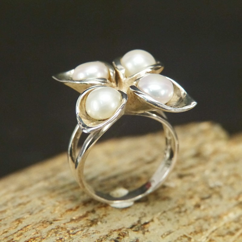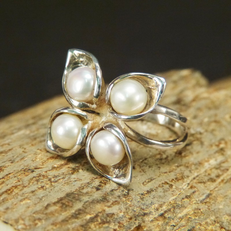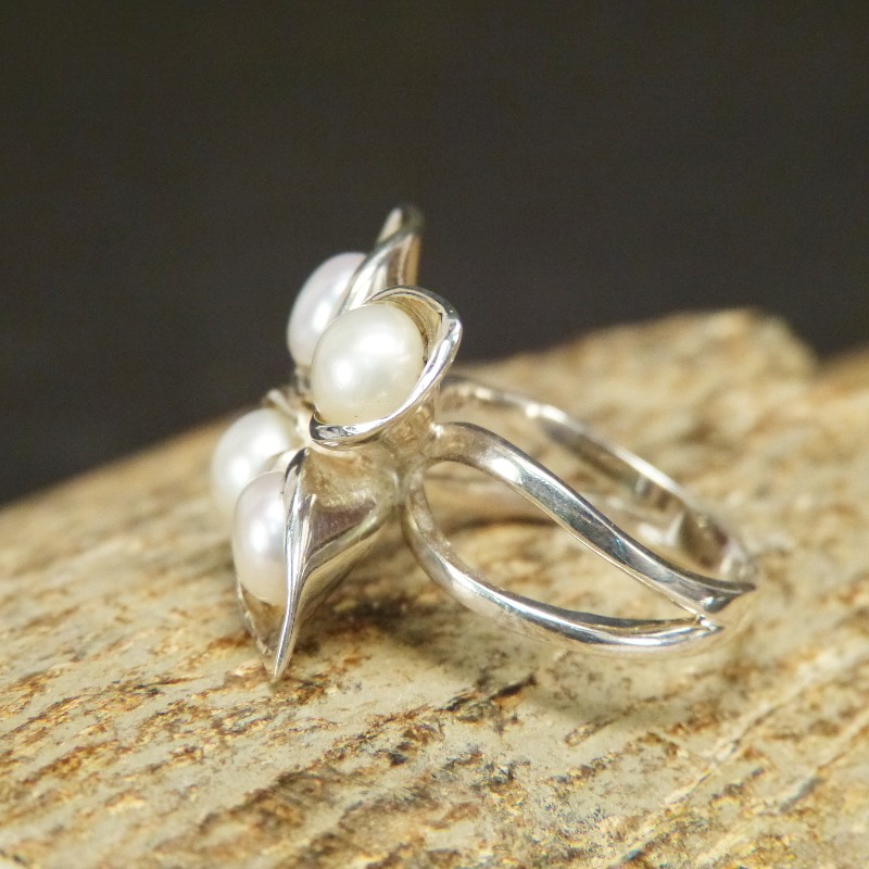 Ring aus 925/-er Silber mit vier Süßwasserperlen, eingebettet in je einen Blütenkelch.