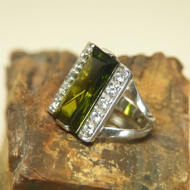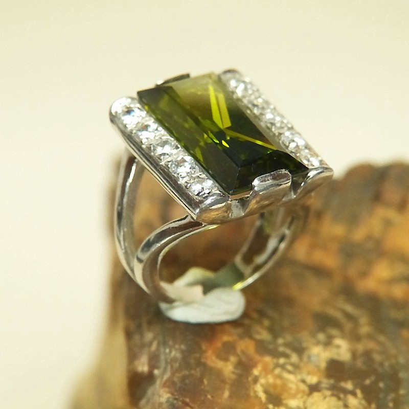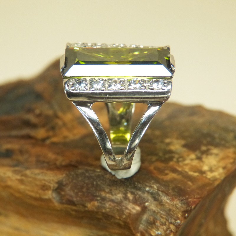 Aus 925/-er Silber gefertigter Ring, kombiniert mit weißen und einem olivfarbenem Zirkonia. Eine zusätzliche Oberflächenrhodinierung bietet Schutz gegen Anlaufen und trägt zur wertigen Optik des Rings bei.