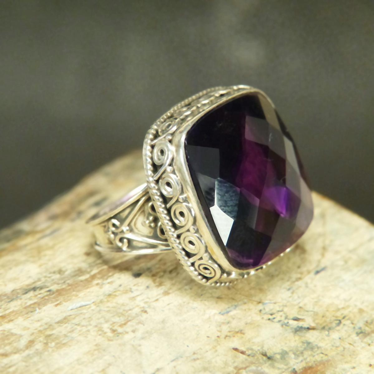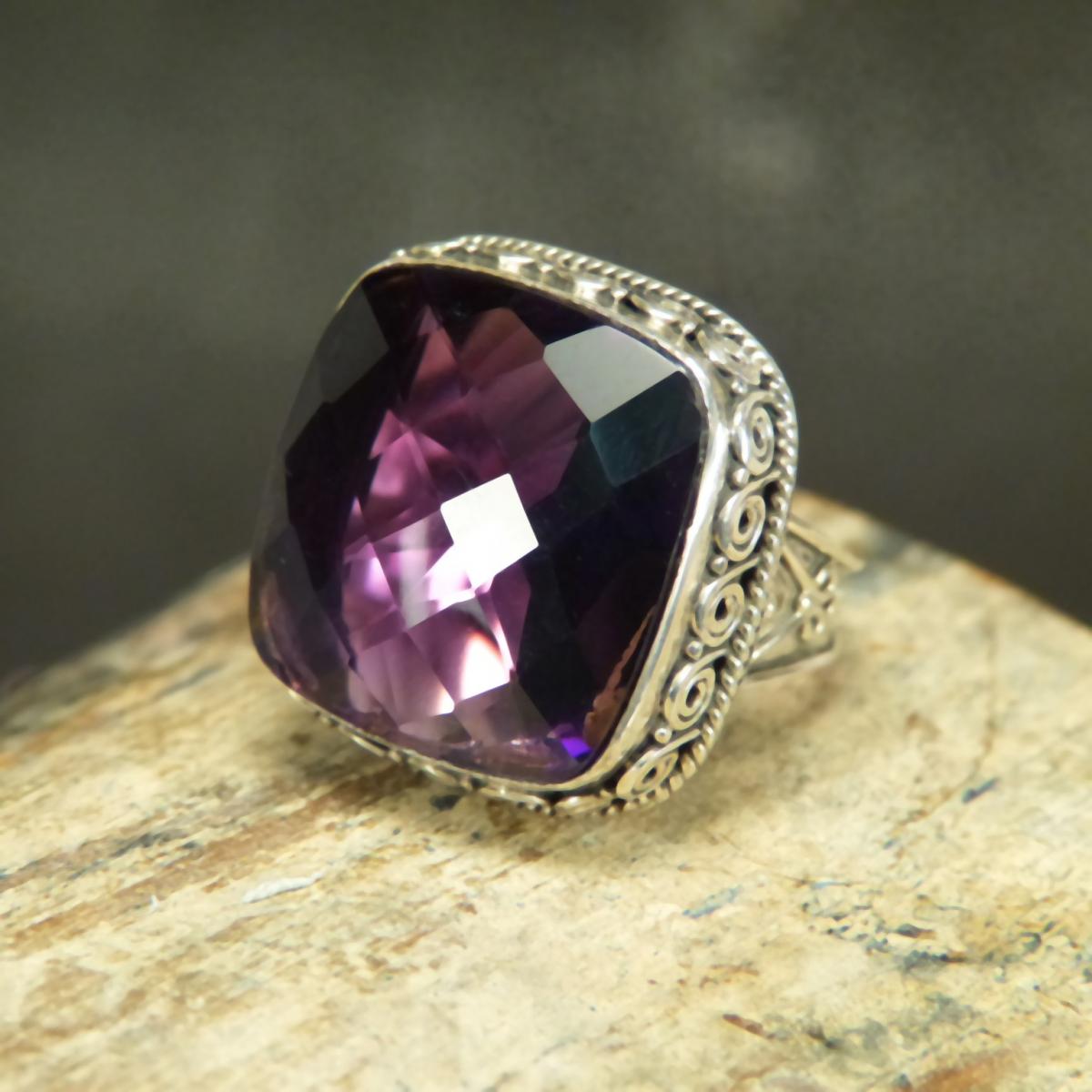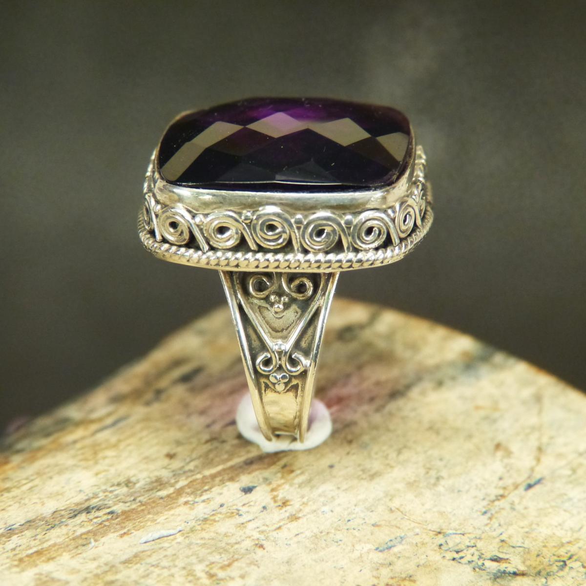 Eckiger Ring aus 925/-er Silber mit facettiertem Amethyst.