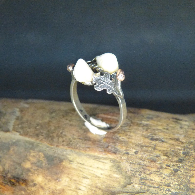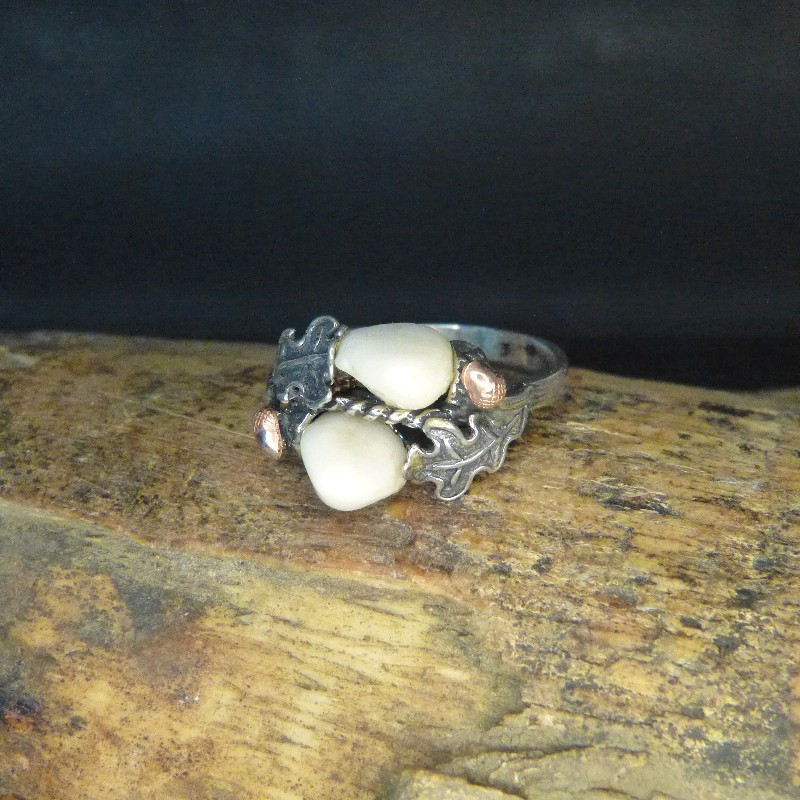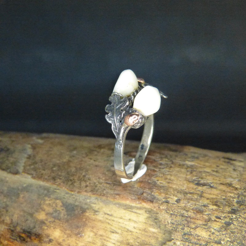 Ring aus Silber mit rotgoldenen Eicheln und zwei Grandeln, verziert mit schön ausgearbeitetem Eichenlaub.