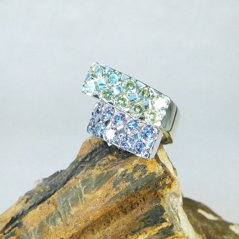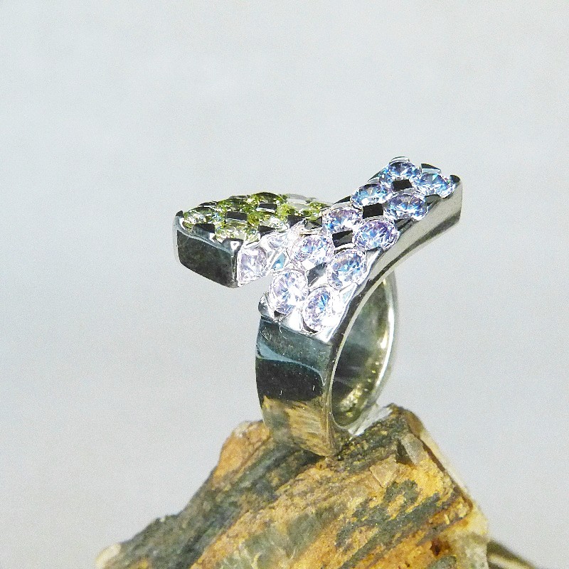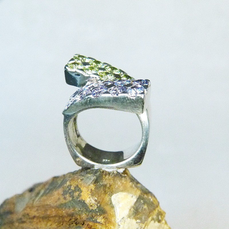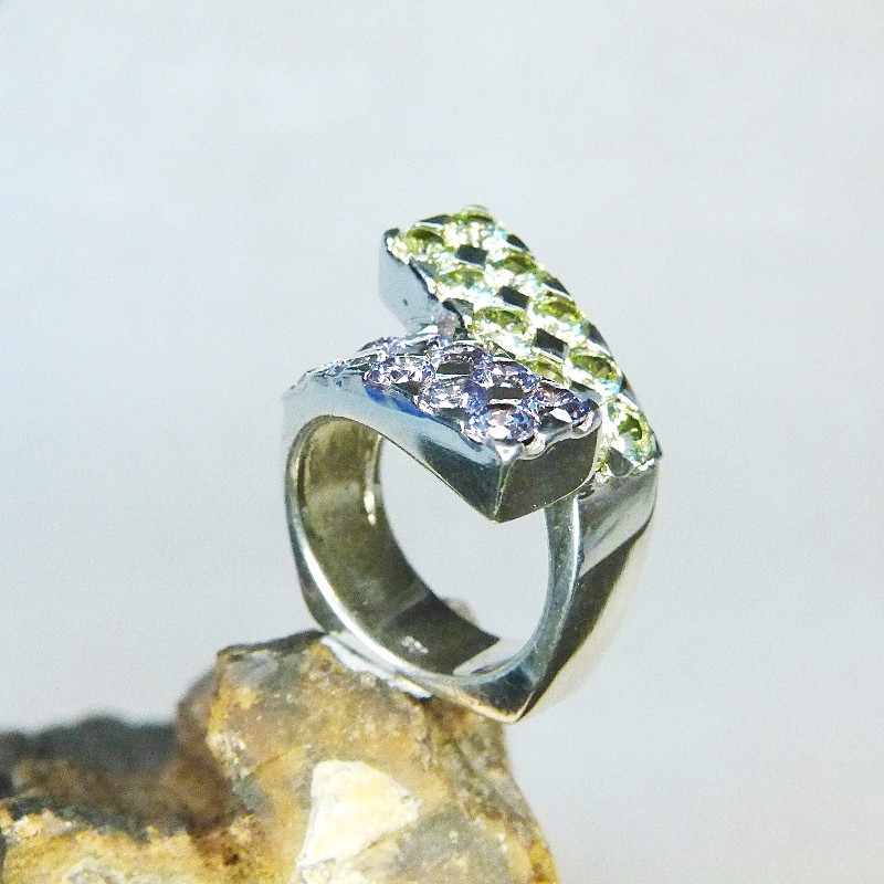 Ring aus 925/-er Silber mit gefassten Zirkonia in den Farben lavendel und Peridot.