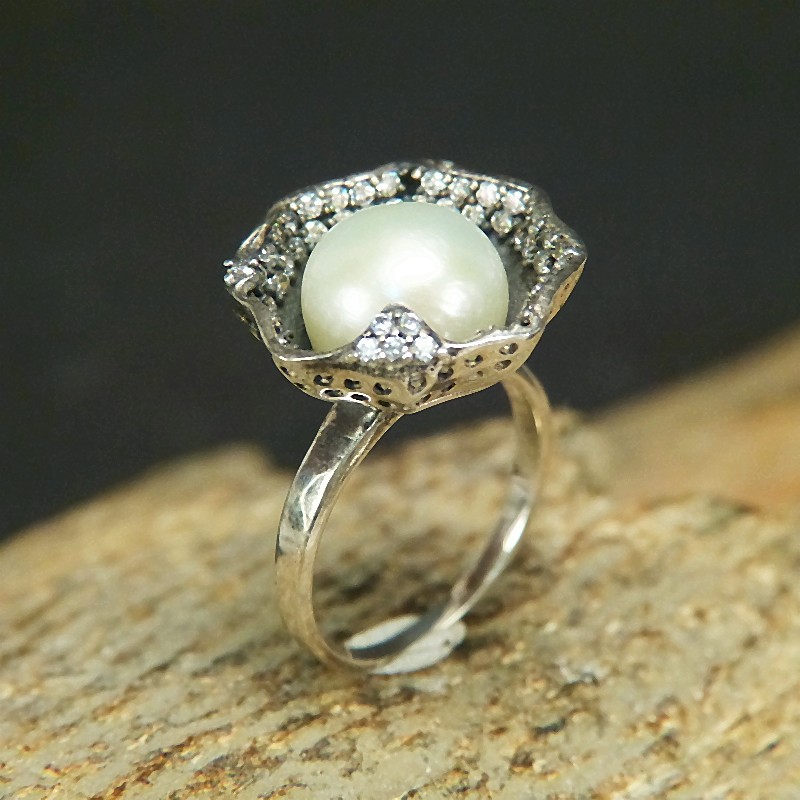 Ring aus 925/-er Silber mit Süßwasserperle, die wie in einem Blütenkelch eingearbeitet wurde und mit vielen fein facettierten Weißtopasen umrahmt ist.