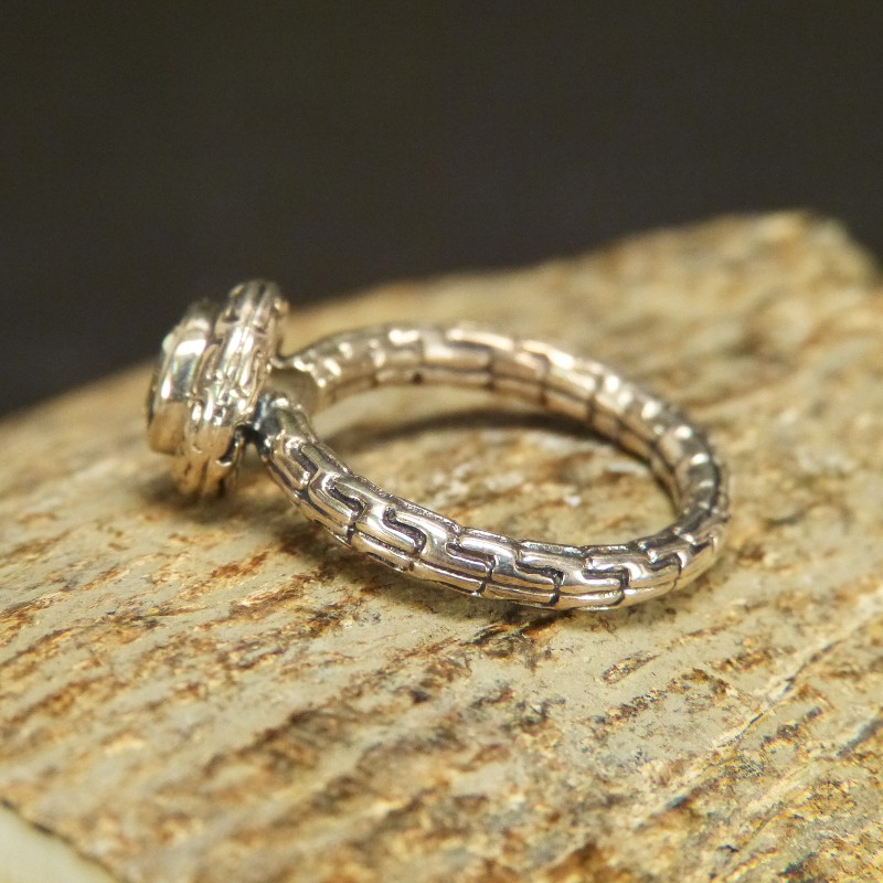 Solider Silberring 925/- mit verzierter Schiene und grünlich schimmerndem Peridot. W 17,2mm