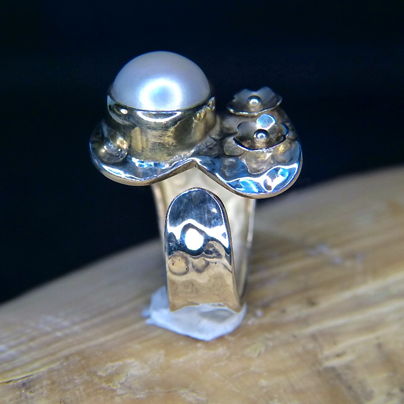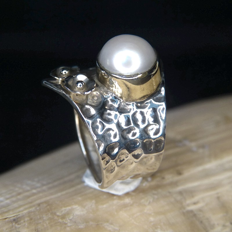 Ring aus gehämmertem Silber 925/- mit Teilvergoldung und echter weißer Süßwasserperle in einer Größe von ca. 9mm.