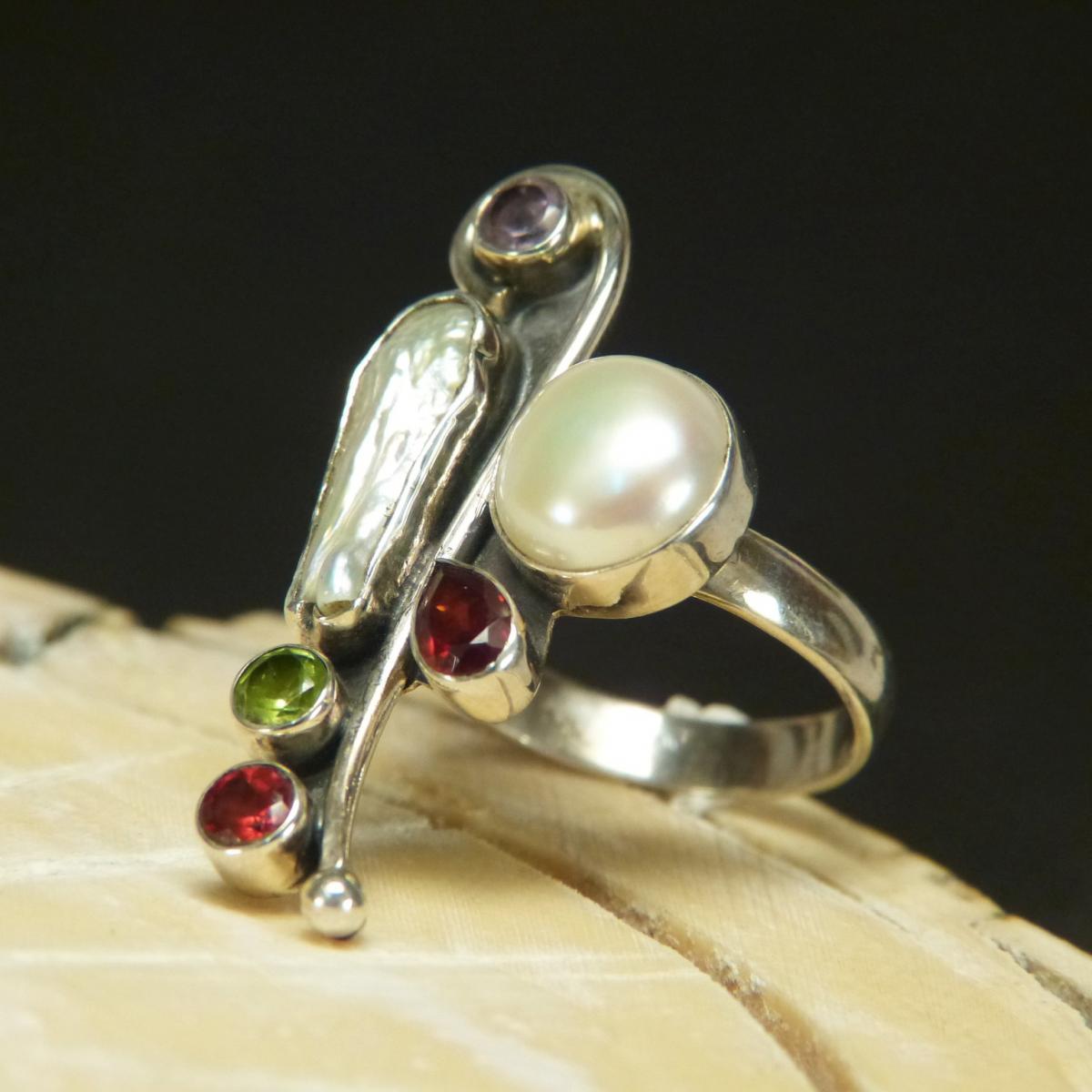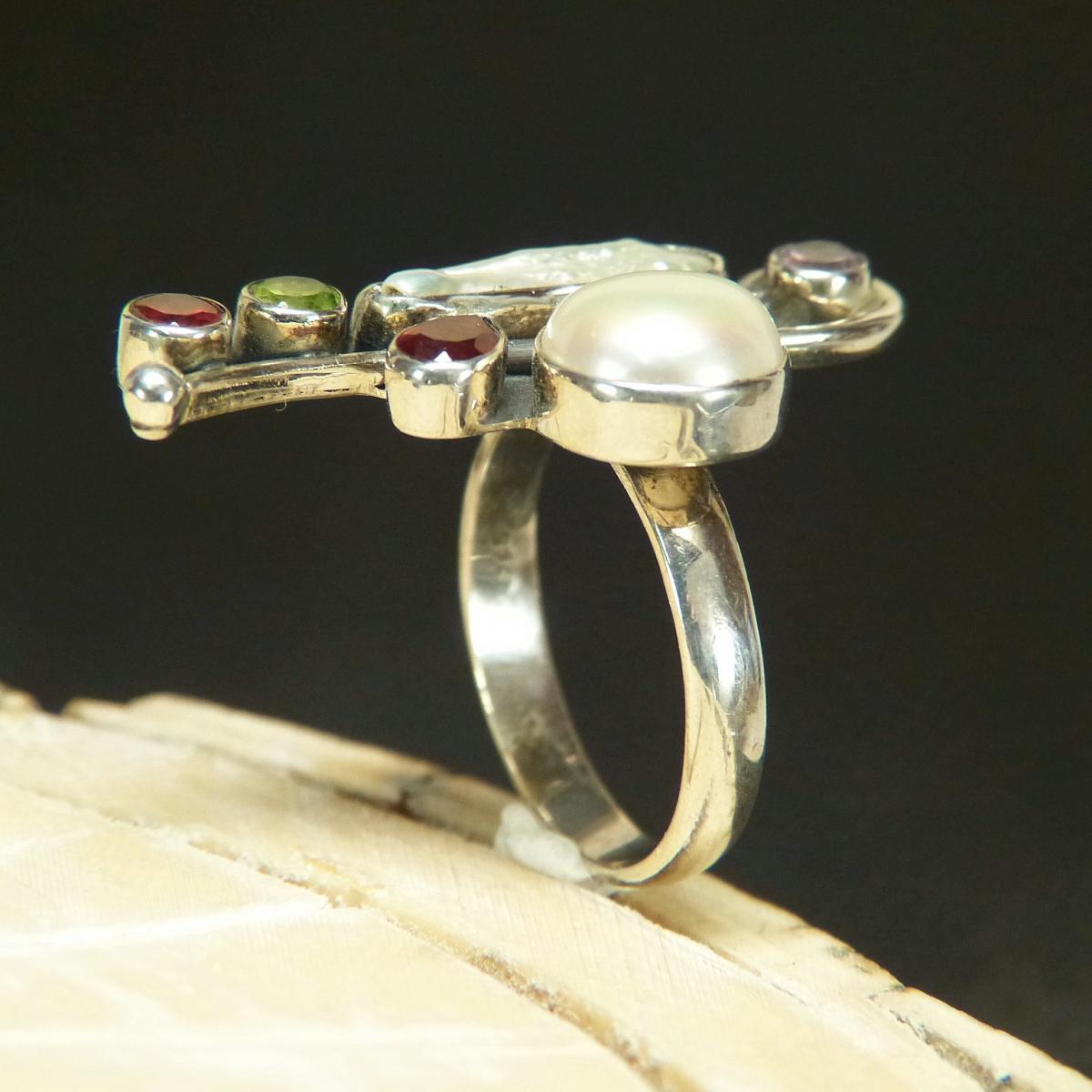 Ring aus 925/-er Silber, besetzt mit Perlen, Granat, Amethyst und Peridot.