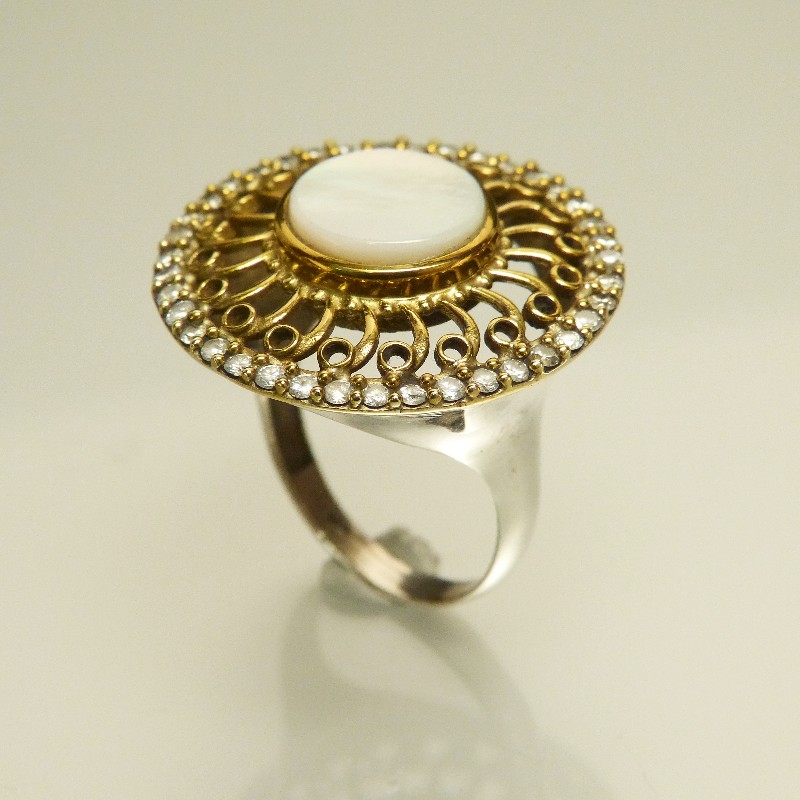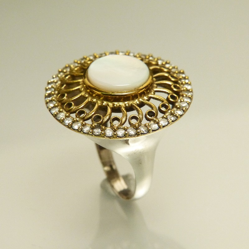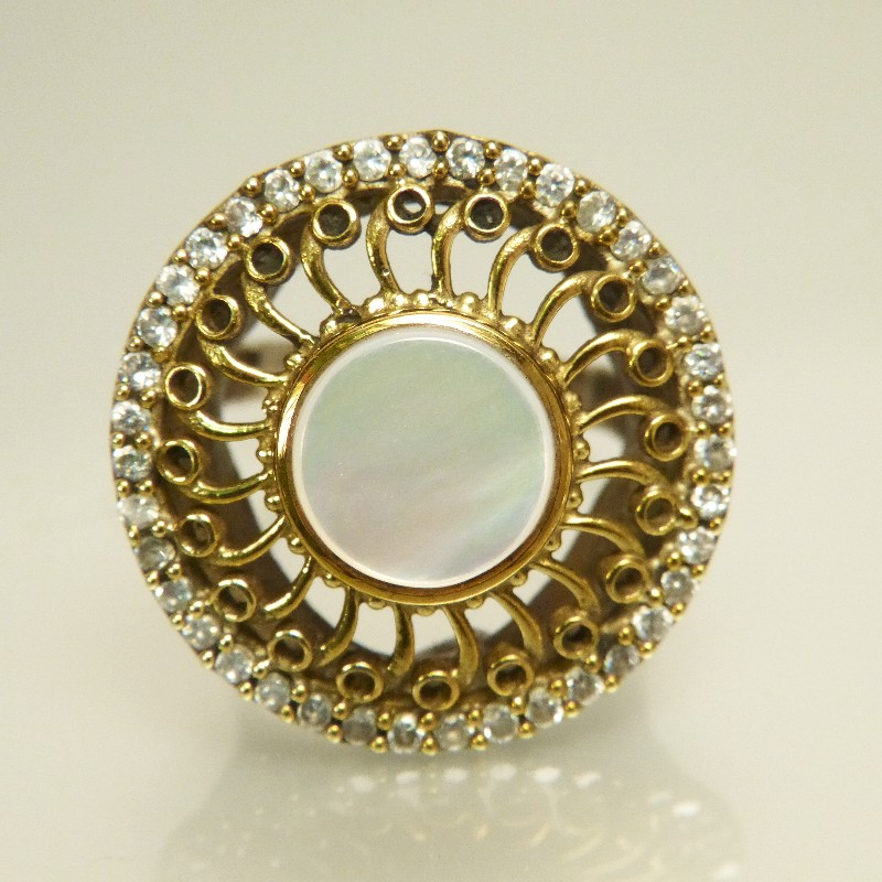 Ring aus 925/- Silber mit Teilvergoldung und gefassten Rubinen sowie weißen Topasen. Die Fassung hat einen Durchmesser von ca. 30mm