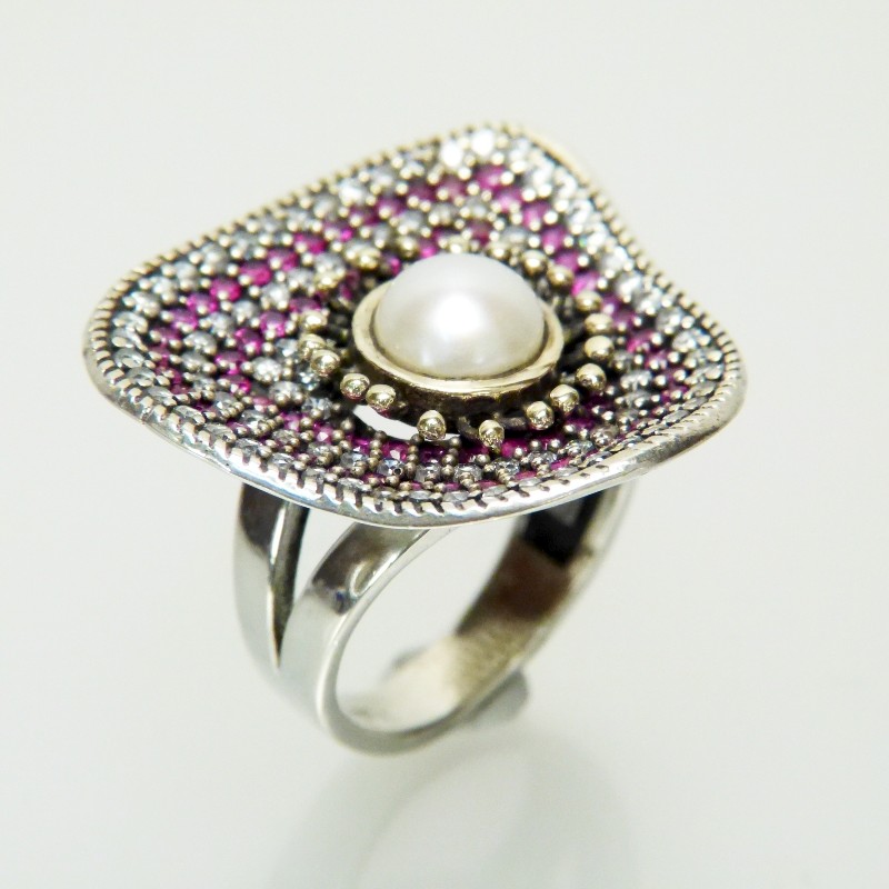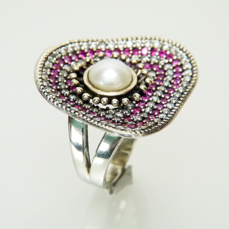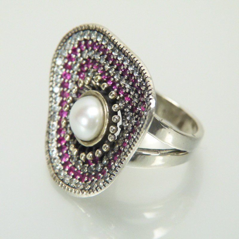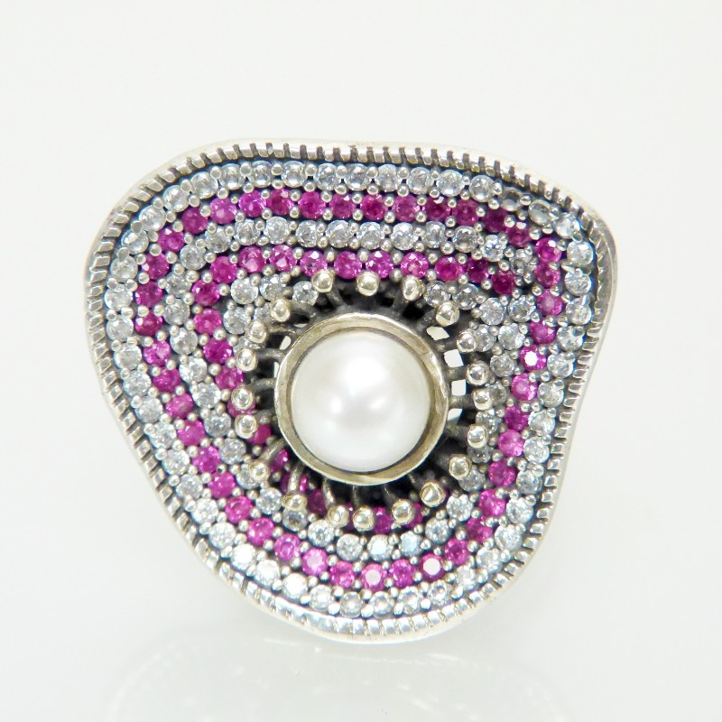 Auffälliger Ring aus Silber 925/- mit eingefassten Rubinen und Weißtopsen sowie einer Süßwasserperle.